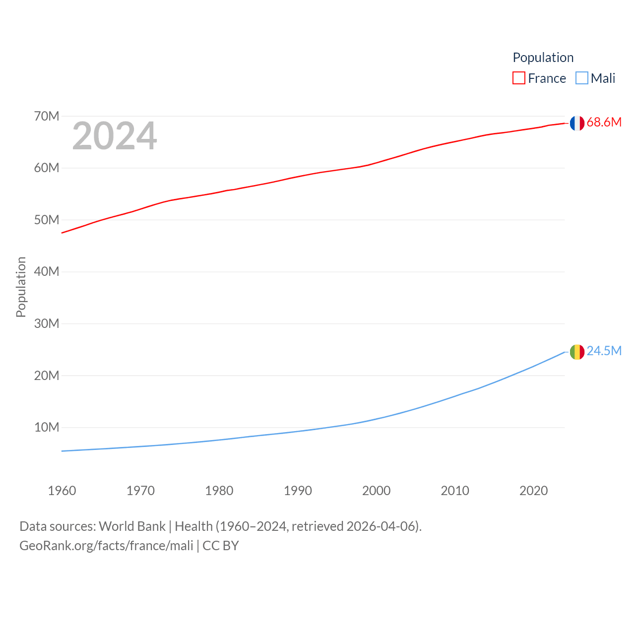 France has a population of 68.6M (ranked 23/197), compared with 24.5M in Mali (ranked 58/197). France's land area is 208,090 sq mi versus 471,118 sq mi for Mali (ranked 48th vs. 23rd).