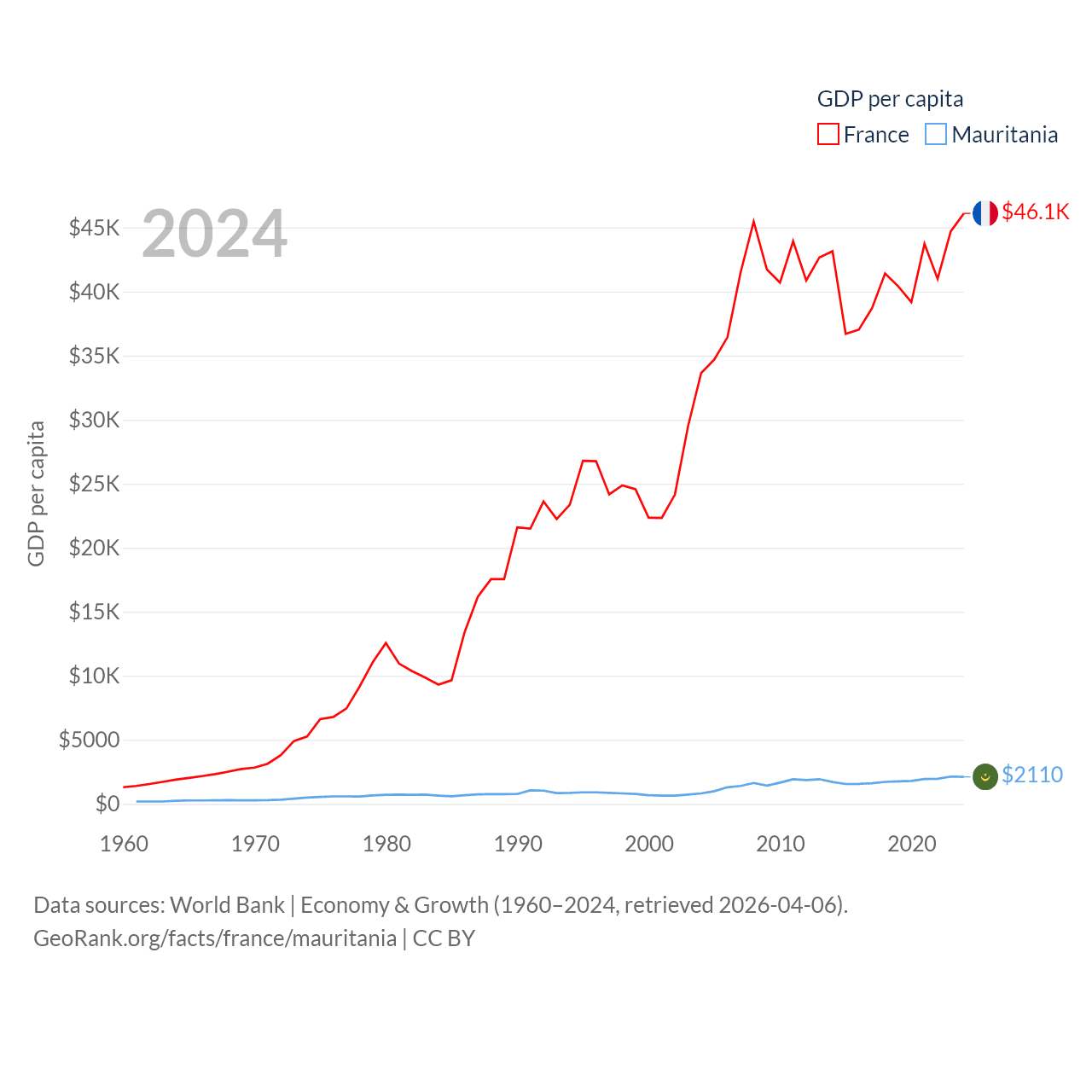By GDP, France ranks 7/197 ($3.16T) and Mauritania ranks 153/197 ($10.9B). By GDP per capita, France ranks 27/197 ($46,103), while Mauritania ranks 156/197 ($2,110).