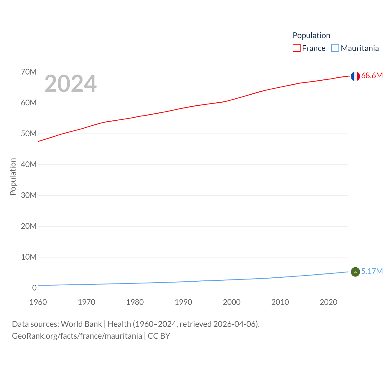 France has a population of 68.6M (ranked 23/197), compared with 5.17M in Mauritania (ranked 125/197). France's land area is 208,090 sq mi versus 397,955 sq mi for Mauritania (ranked 48th vs. 28th).