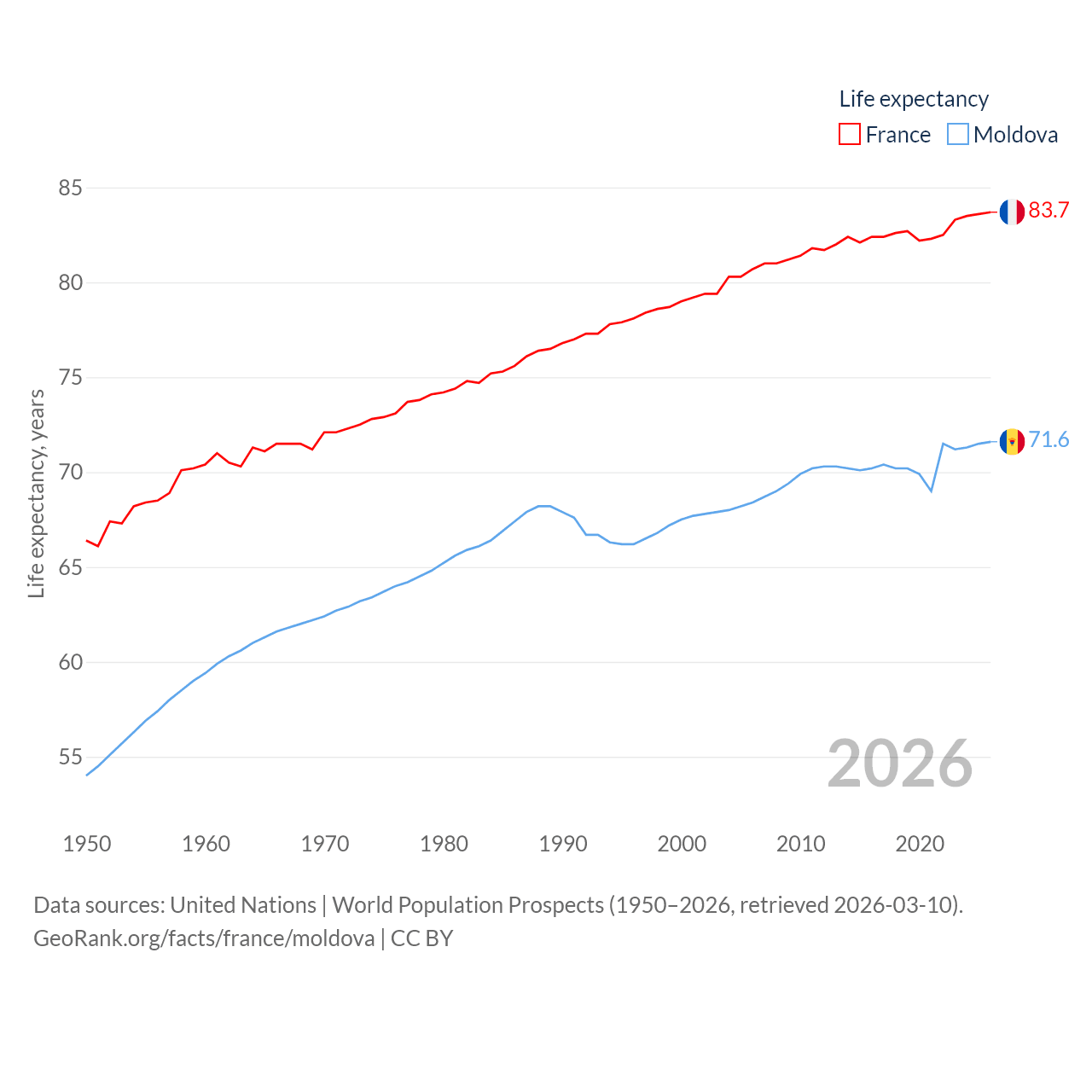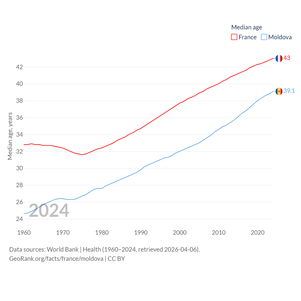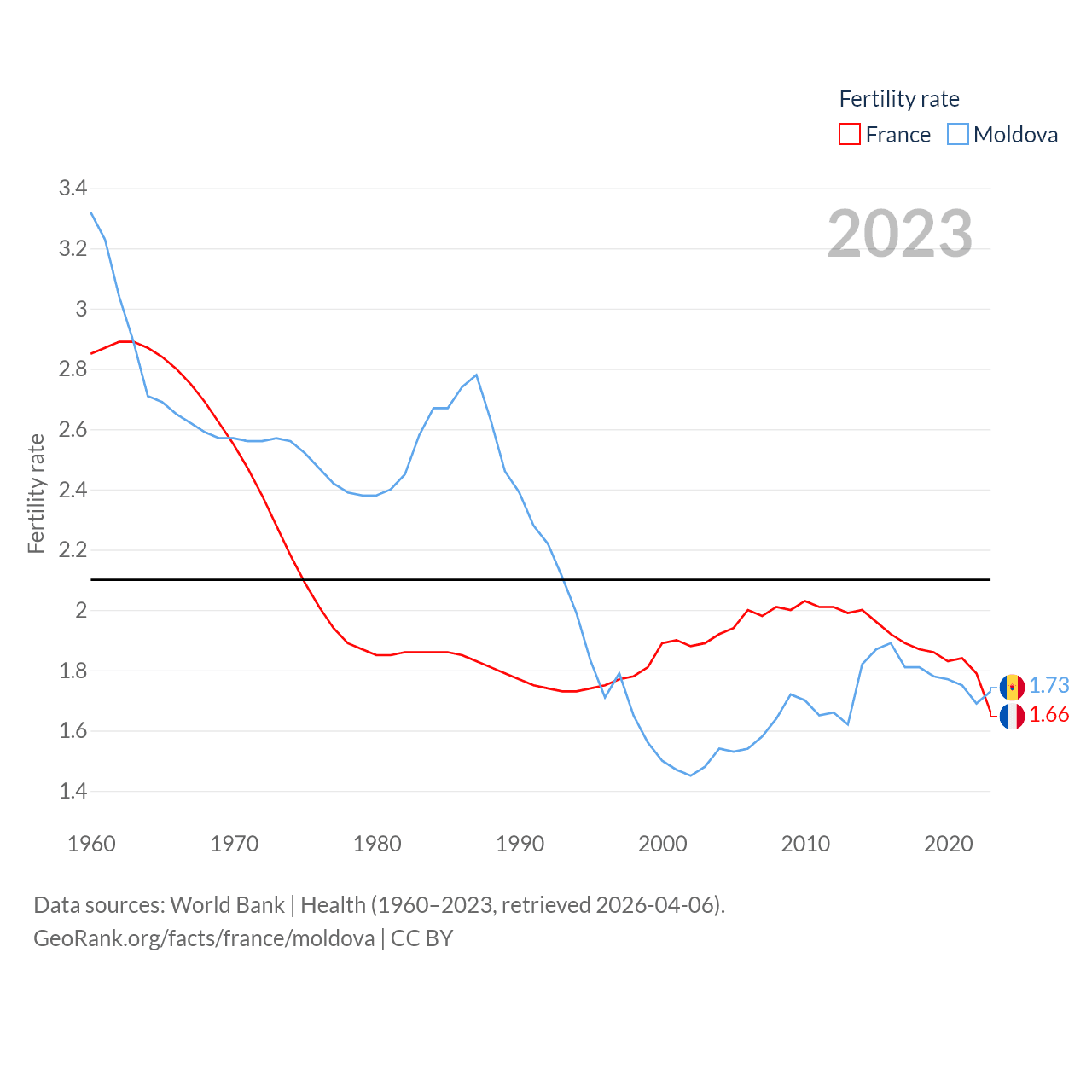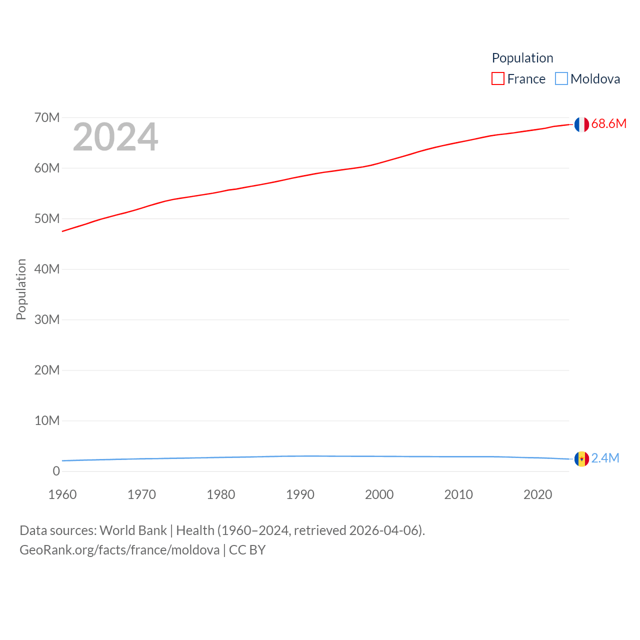 France has a population of 68.6M (ranked 23/197), compared with 2.4M in Moldova (ranked 143/197). France's land area is 208,090 sq mi versus 12,714 sq mi for Moldova (ranked 48th vs. 135th).