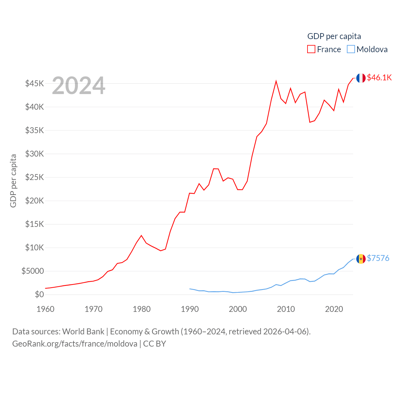 By GDP, France ranks 7/197 ($3.16T) and Moldova ranks 134/197 ($18.2B). By GDP per capita, France ranks 27/197 ($46,103), while Moldova ranks 99/197 ($7,576).