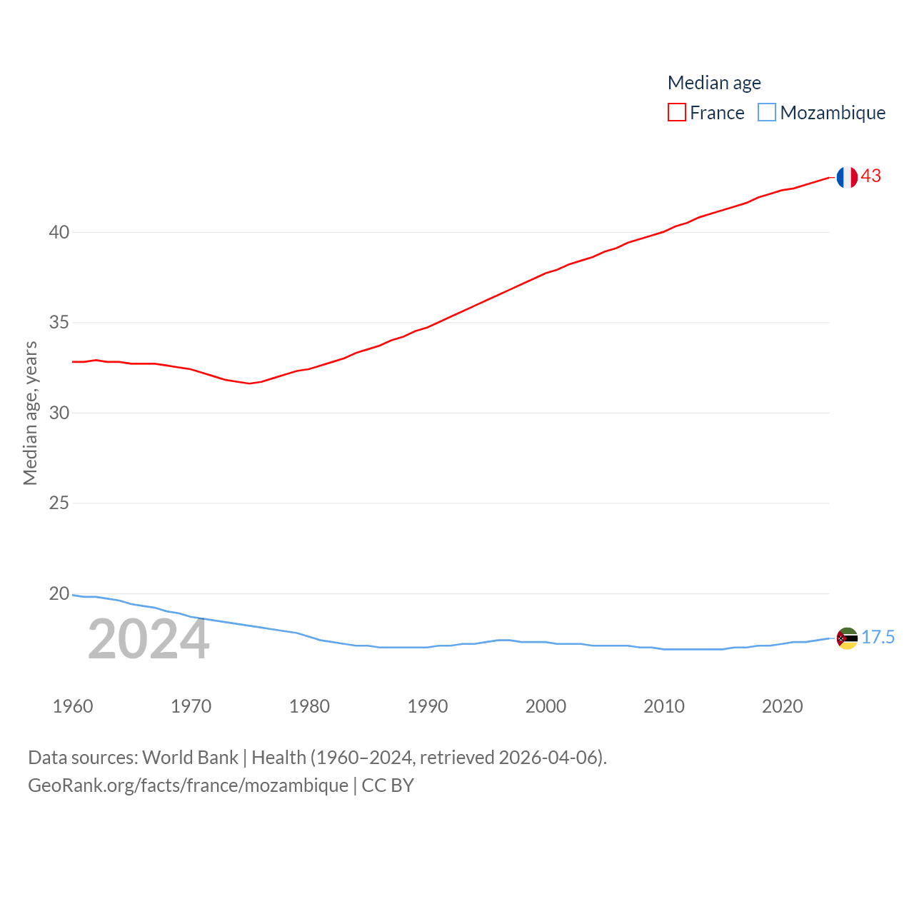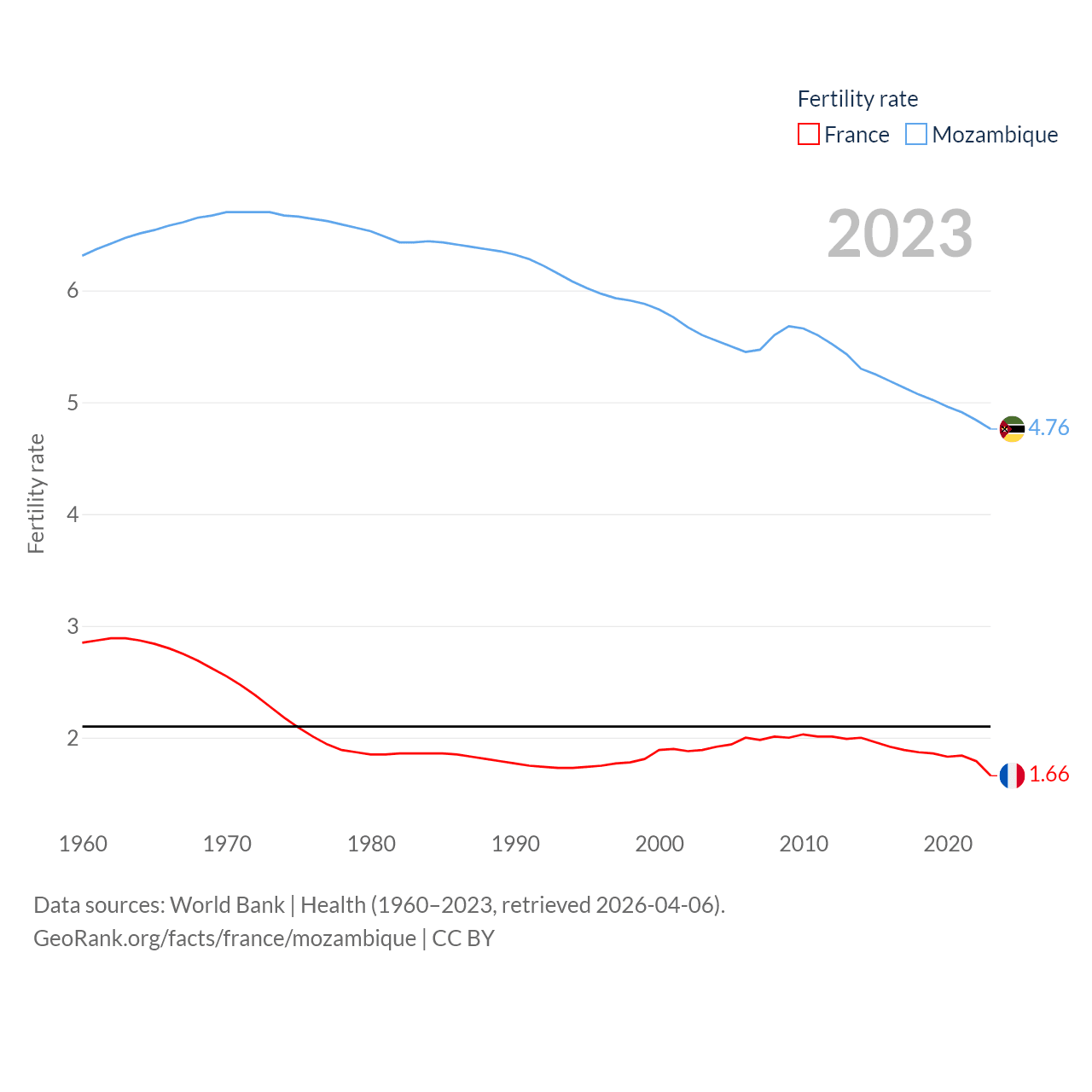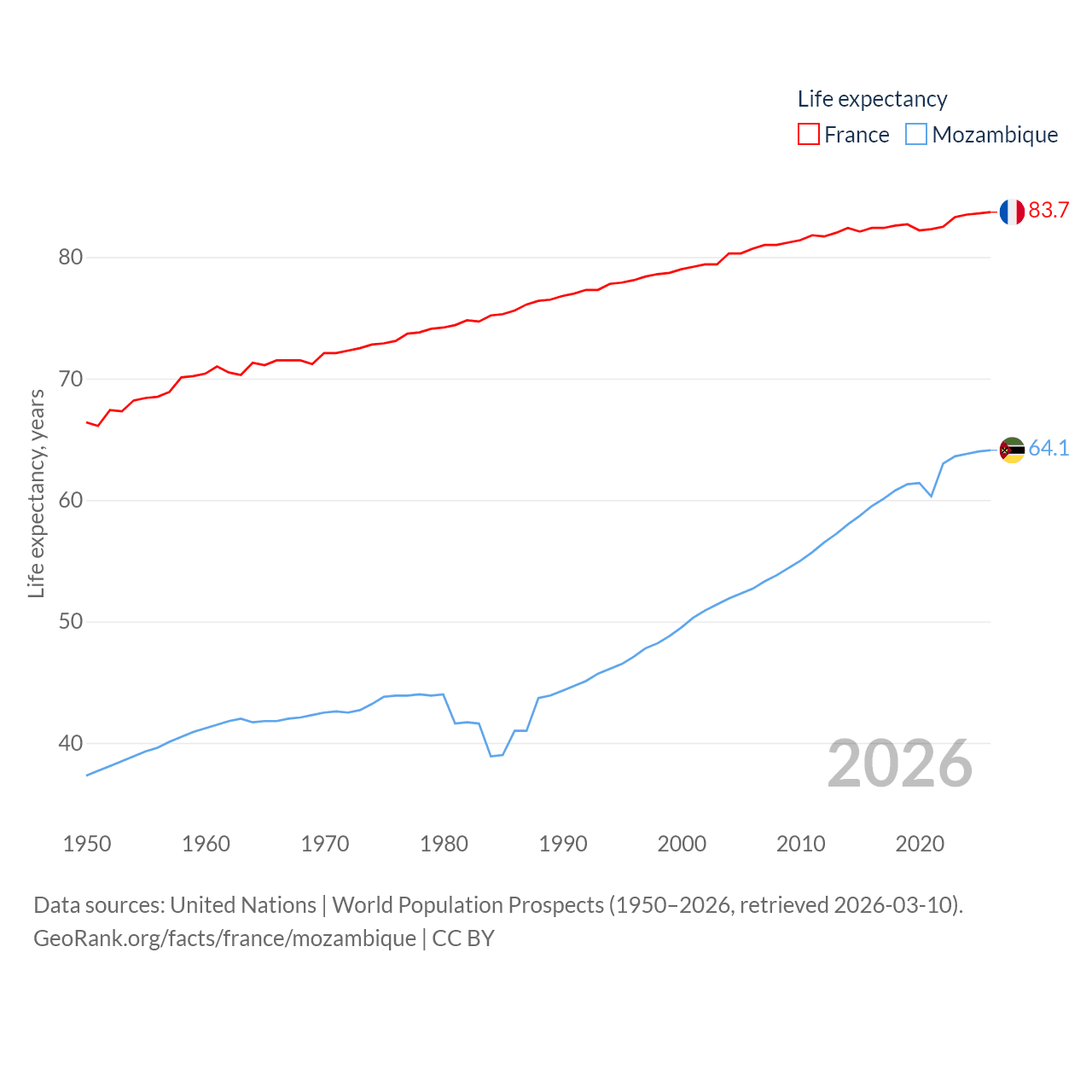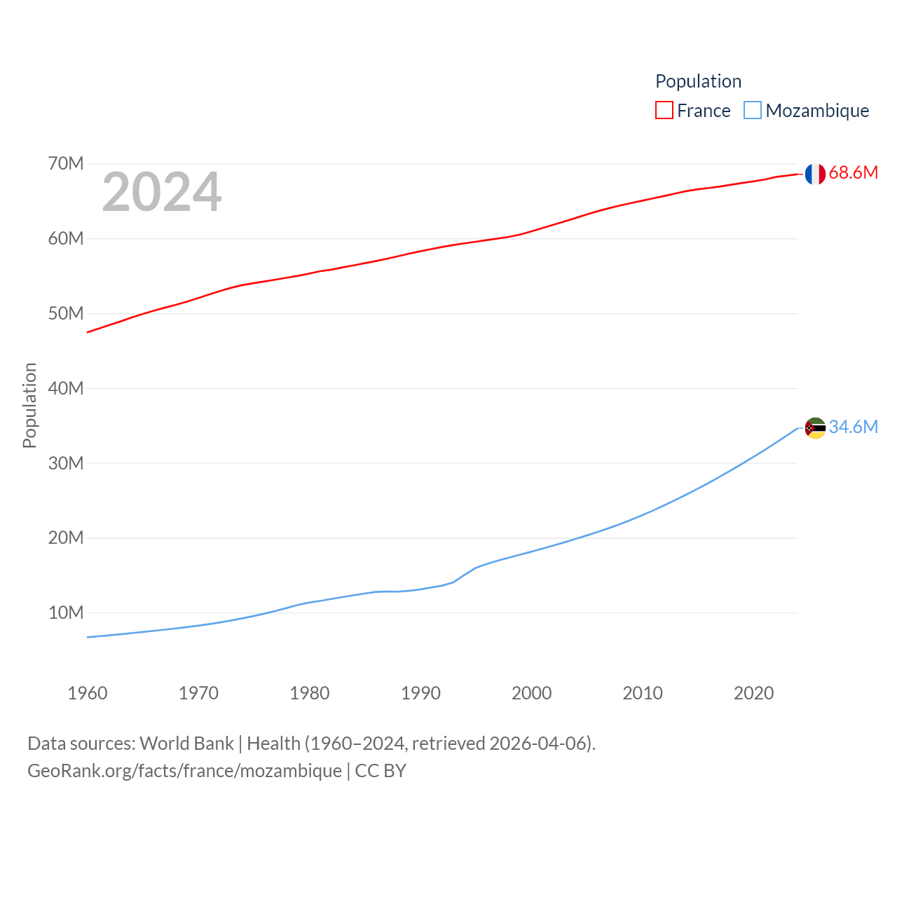 France has a population of 68.6M (ranked 23/197), compared with 34.6M in Mozambique (ranked 46/197). France's land area is 208,090 sq mi versus 303,623 sq mi for Mozambique (ranked 48th vs. 34th).