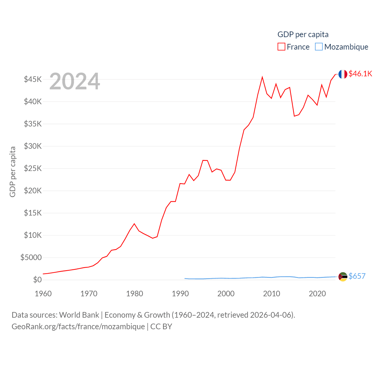 By GDP, France ranks 7/197 ($3.16T) and Mozambique ranks 123/197 ($22.7B). By GDP per capita, France ranks 27/197 ($46,103), while Mozambique ranks 189/197 ($657).
