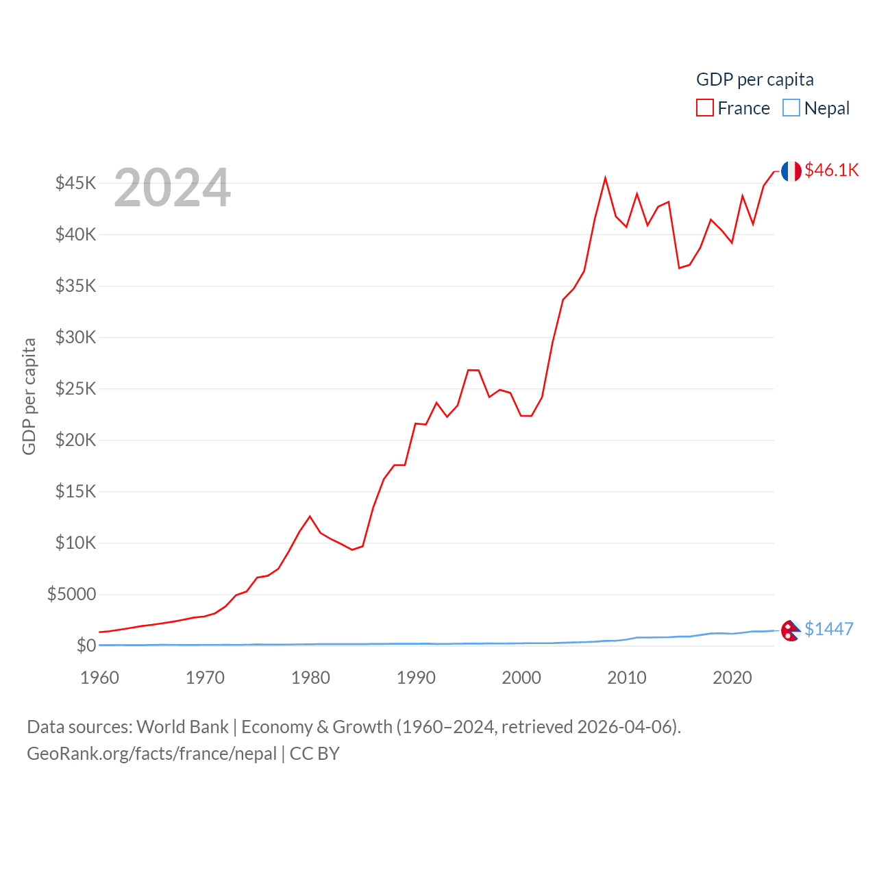 By GDP, France ranks 7/197 ($3.16T) and Nepal ranks 101/197 ($42.9B). By GDP per capita, France ranks 27/197 ($46,103), while Nepal ranks 164/197 ($1,447).