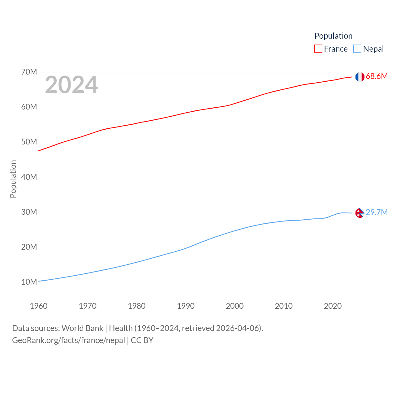 France has a population of 68.6M (ranked 23/197), compared with 29.7M in Nepal (ranked 51/197). France's land area is 208,090 sq mi versus 55,348 sq mi for Nepal (ranked 48th vs. 92nd).