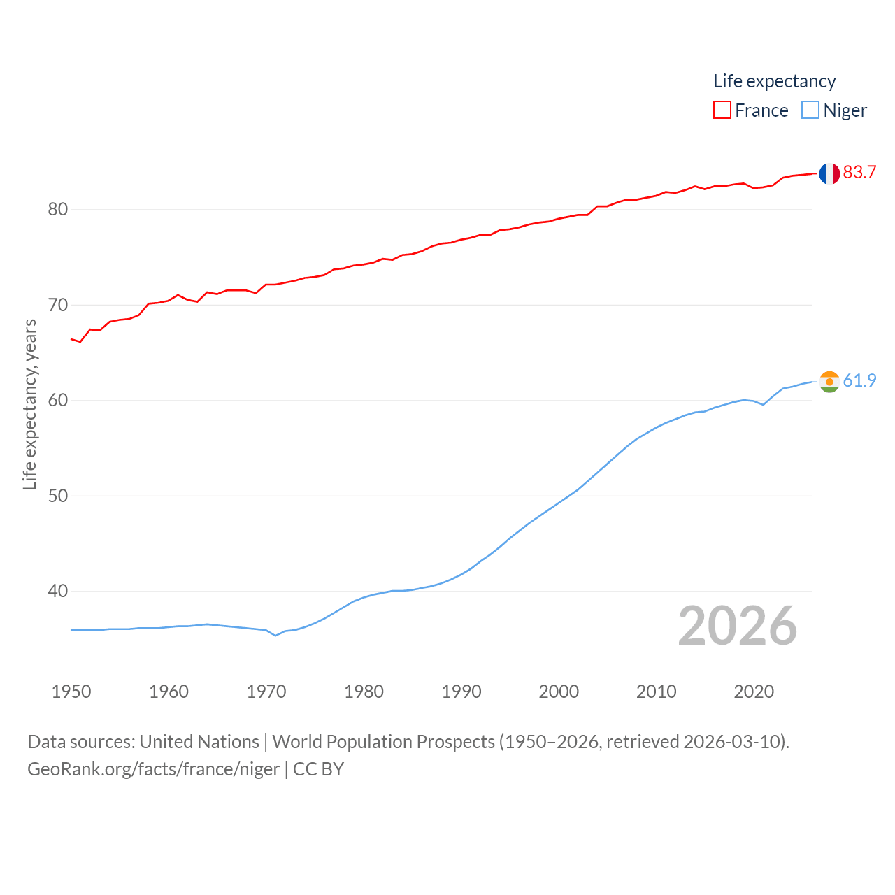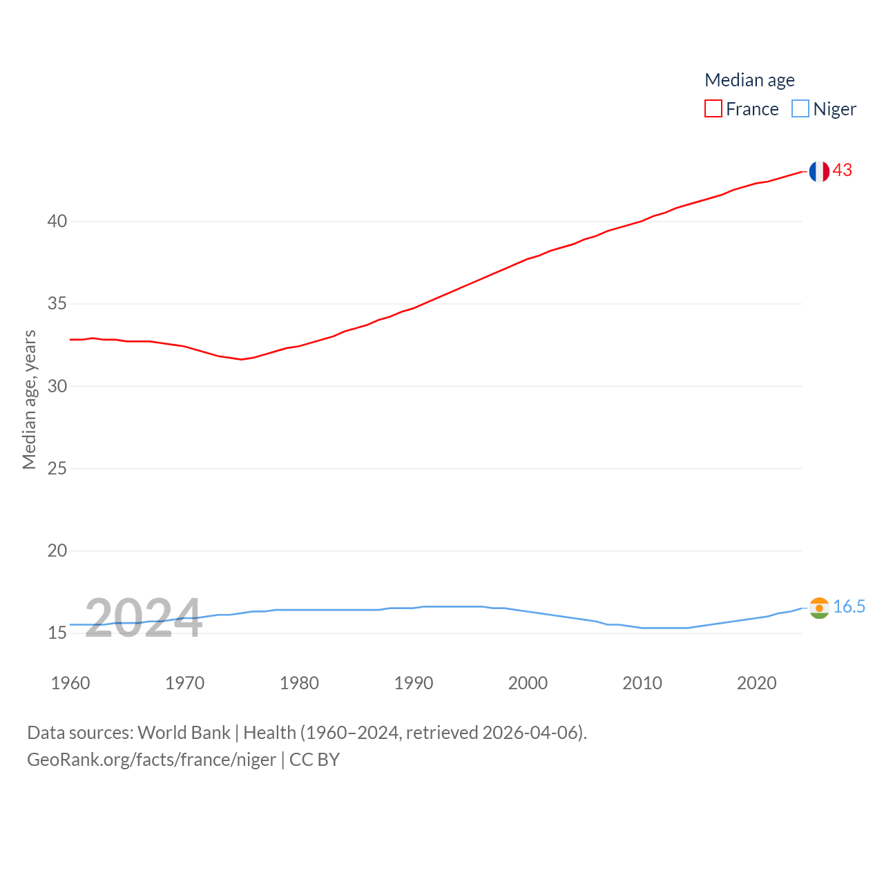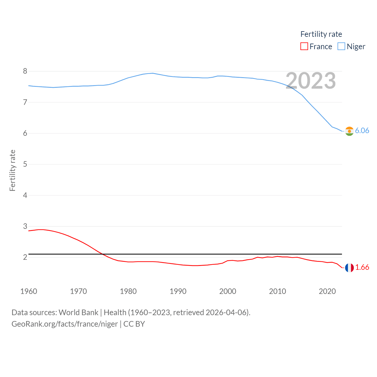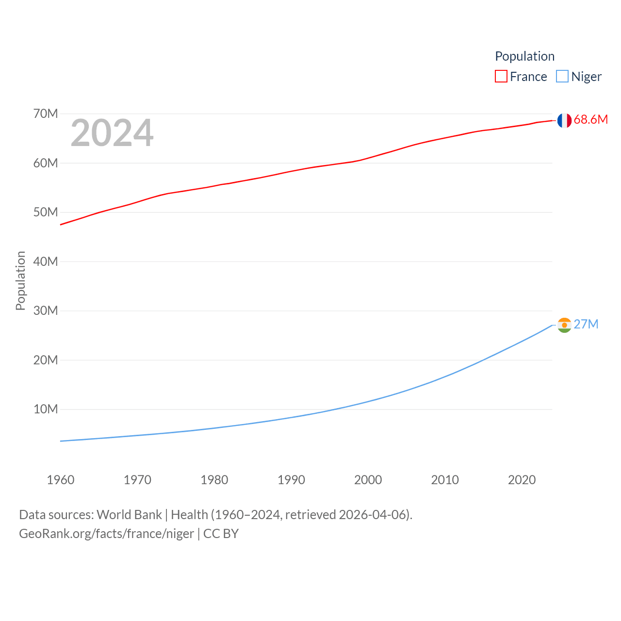 France has a population of 68.6M (ranked 23/197), compared with 27M in Niger (ranked 55/197). France's land area is 208,090 sq mi versus 489,076 sq mi for Niger (ranked 48th vs. 20th).