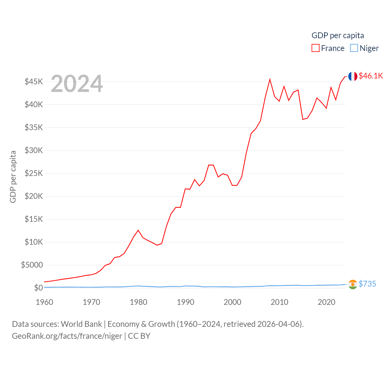 By GDP, France ranks 7/197 ($3.16T) and Niger ranks 130/197 ($19.9B). By GDP per capita, France ranks 27/197 ($46,103), while Niger ranks 187/197 ($735).