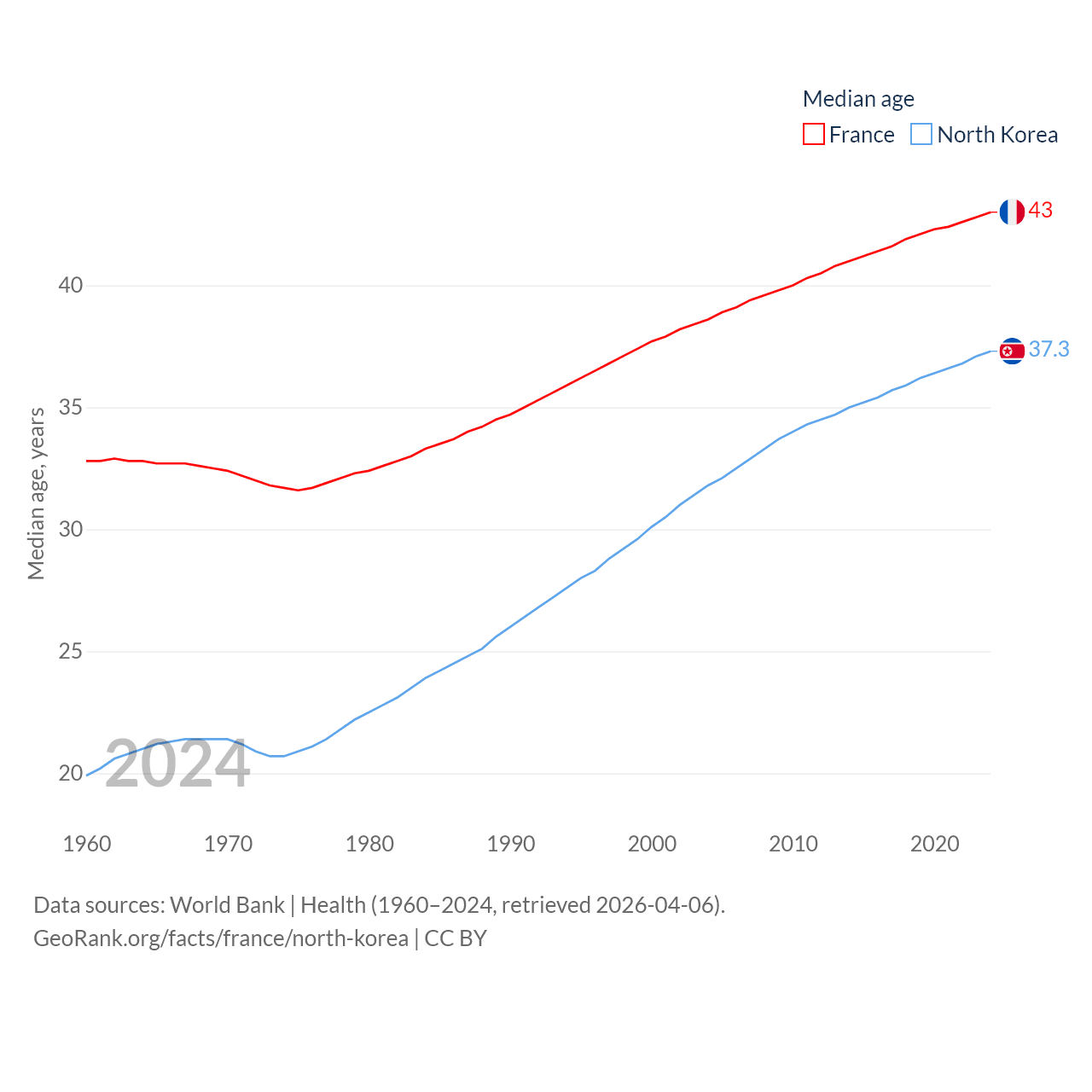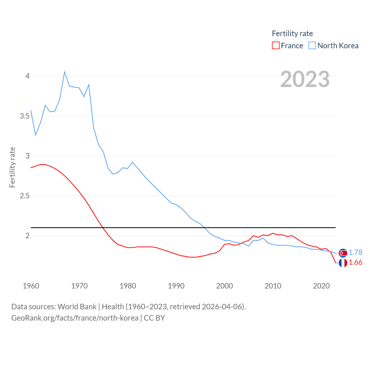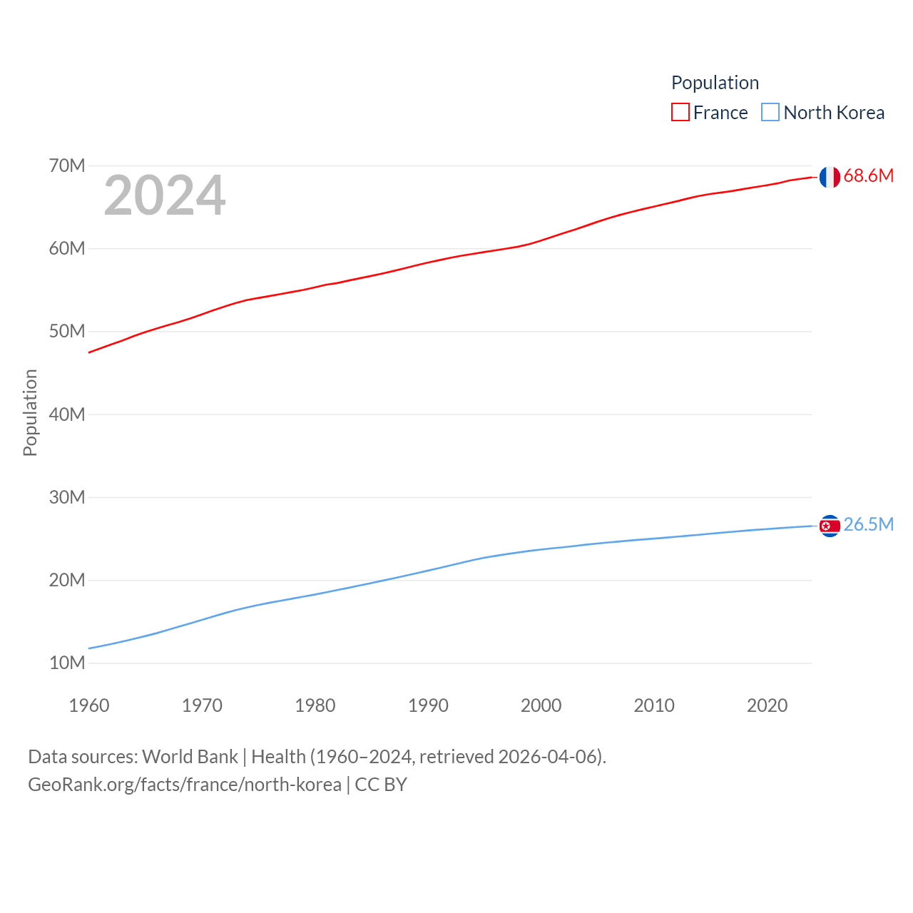 France has a population of 68.6M (ranked 23/197), compared with 26.5M in North Korea (ranked 56/197). France's land area is 208,090 sq mi versus 46,491 sq mi for North Korea (ranked 48th vs. 97th).