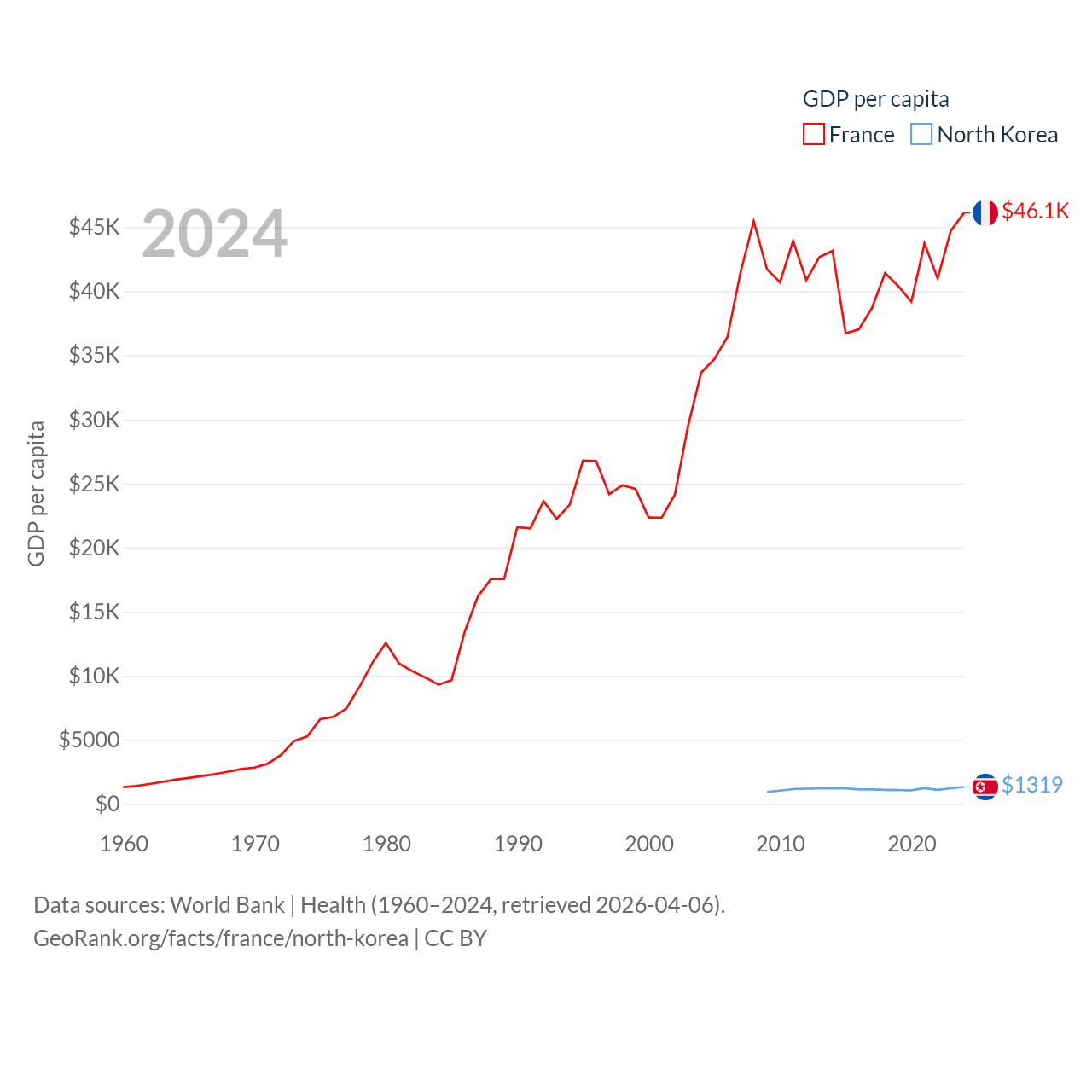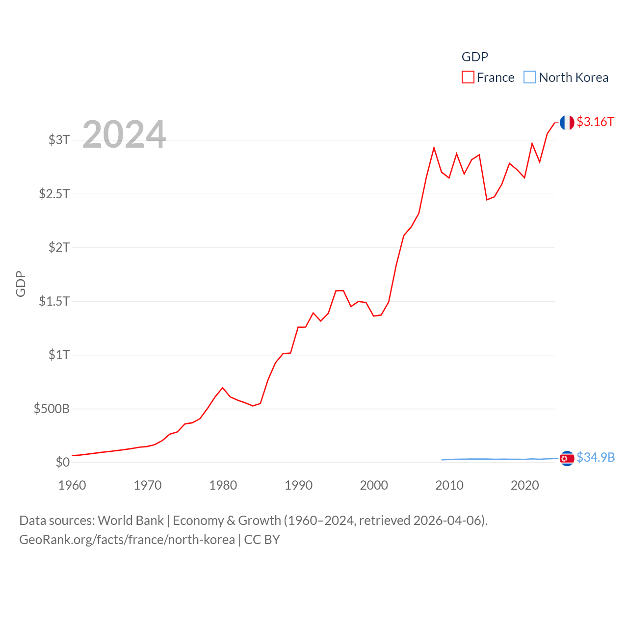 By GDP, France ranks 7/197 ($3.16T) and North Korea ranks 106/197 ($34.9B). By GDP per capita, France ranks 27/197 ($46,103), while North Korea ranks 168/197 ($1,319).