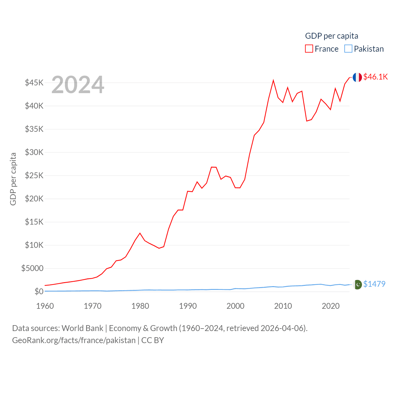 By GDP, France ranks 7/197 ($3.16T) and Pakistan ranks 43/197 ($372B). By GDP per capita, France ranks 27/197 ($46,103), while Pakistan ranks 163/197 ($1,479).