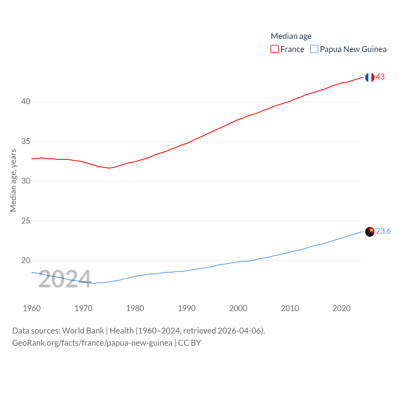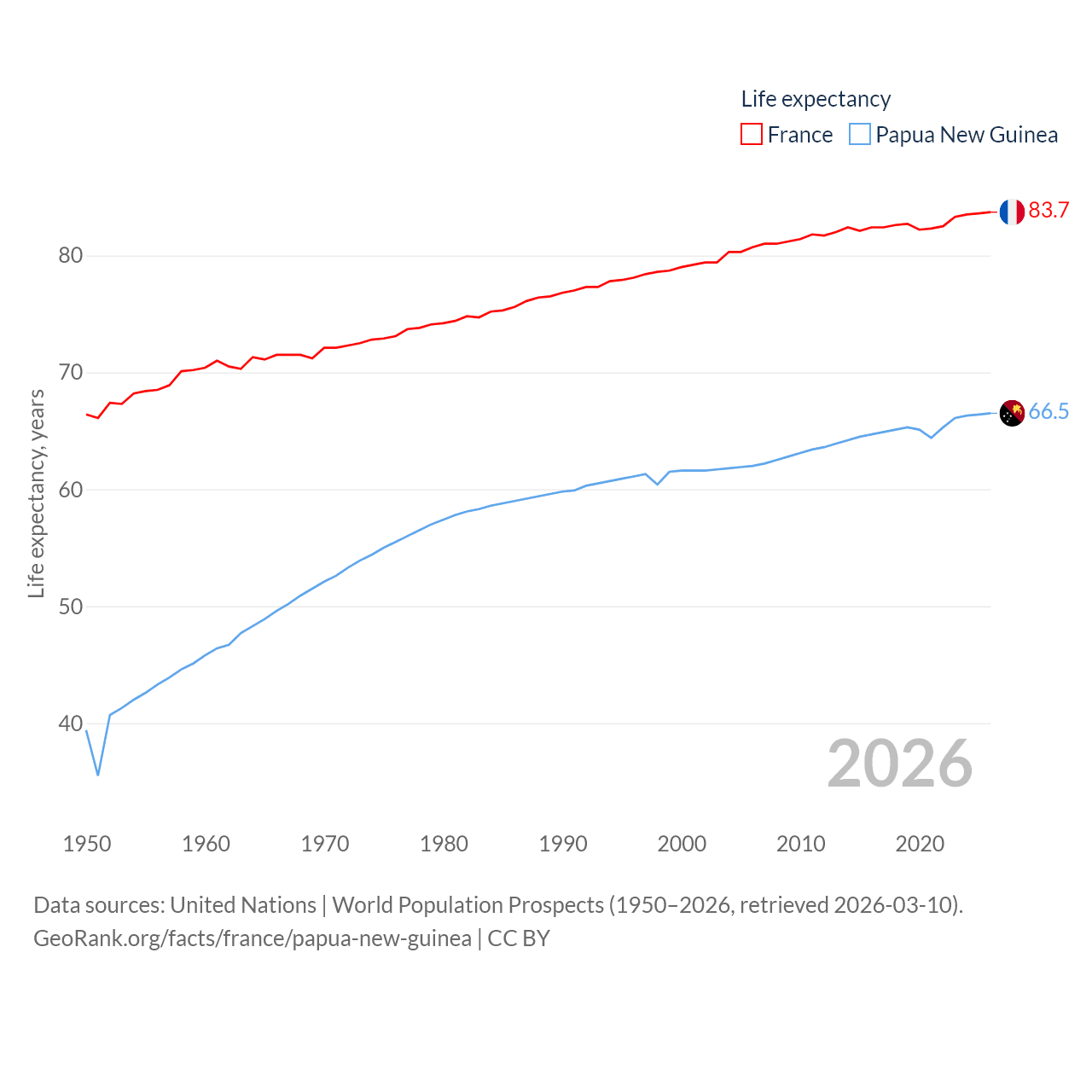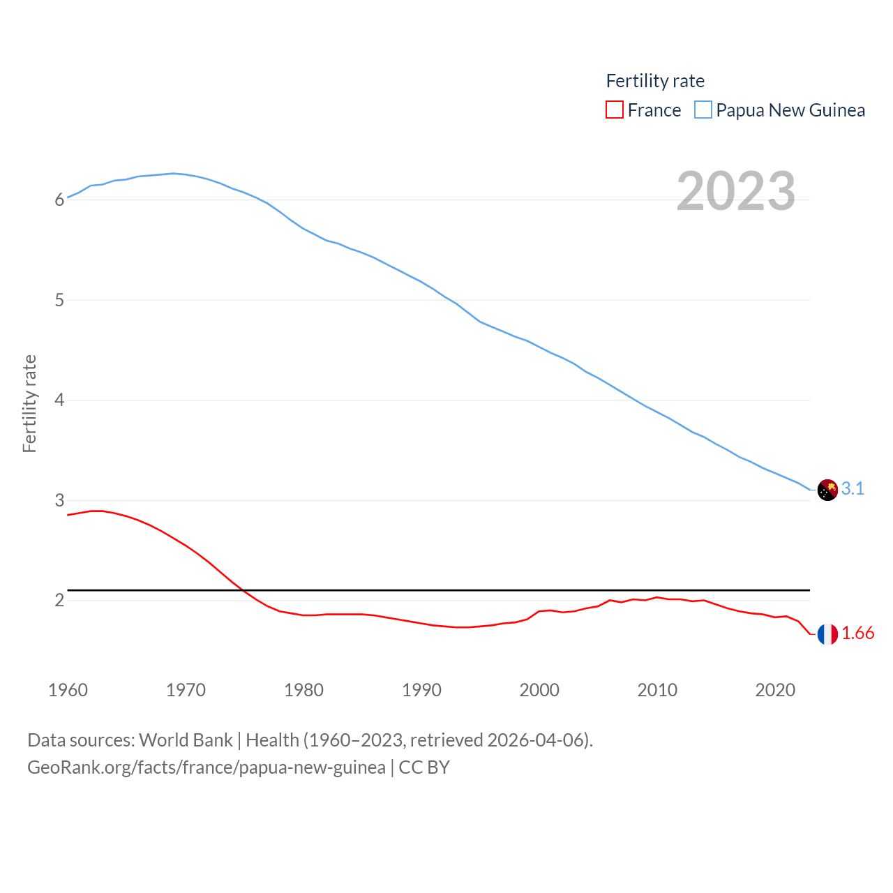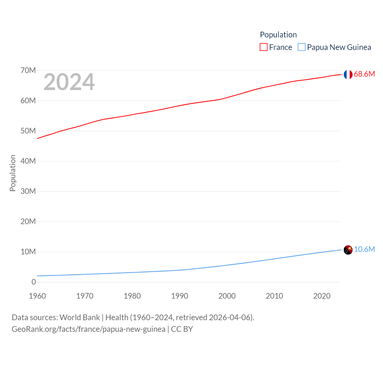 France has a population of 68.6M (ranked 23/197), compared with 10.6M in Papua New Guinea (ranked 92/197). France's land area is 208,090 sq mi versus 174,850 sq mi for Papua New Guinea (ranked 48th vs. 54th).