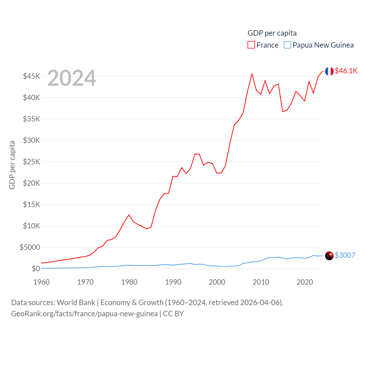 By GDP, France ranks 7/197 ($3.16T) and Papua New Guinea ranks 110/197 ($31.8B). By GDP per capita, France ranks 27/197 ($46,103), while Papua New Guinea ranks 140/197 ($3,007).