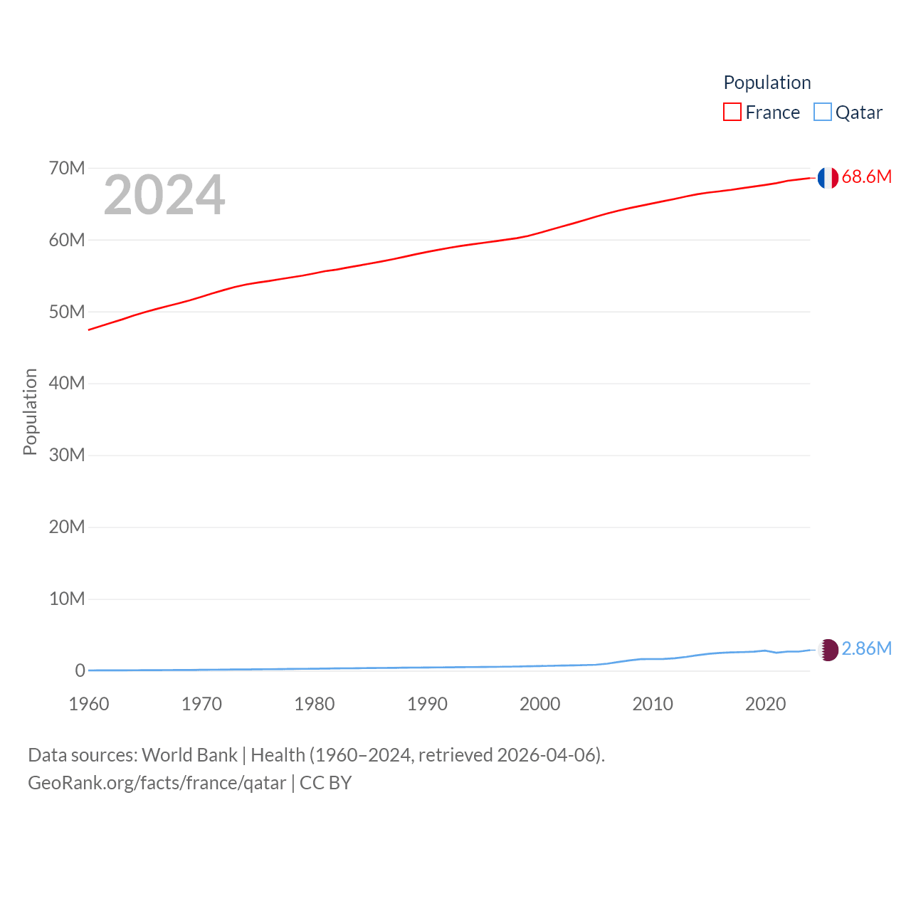 France has a population of 68.6M (ranked 23/197), compared with 2.86M in Qatar (ranked 138/197). France's land area is 208,090 sq mi versus 4,436 sq mi for Qatar (ranked 48th vs. 158th).