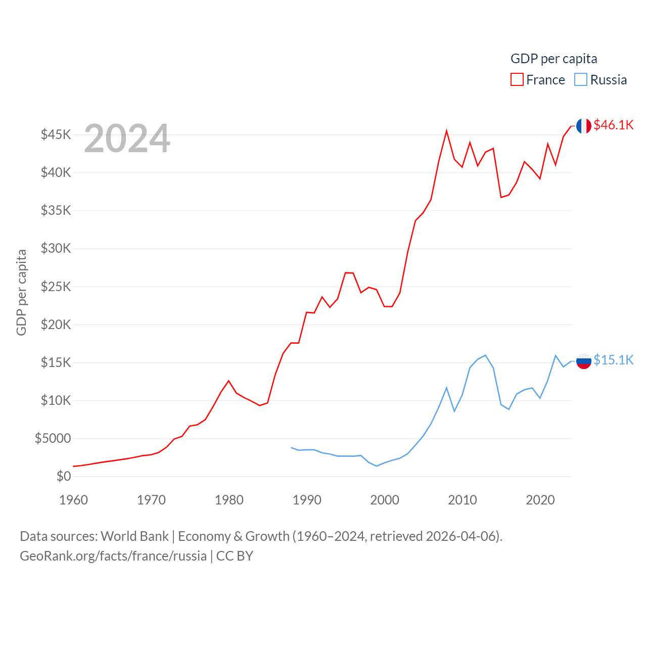 By GDP, France ranks 7/197 ($3.16T) and Russia ranks 11/197 ($2.17T). By GDP per capita, France ranks 27/197 ($46,103), while Russia ranks 68/197 ($15,145).