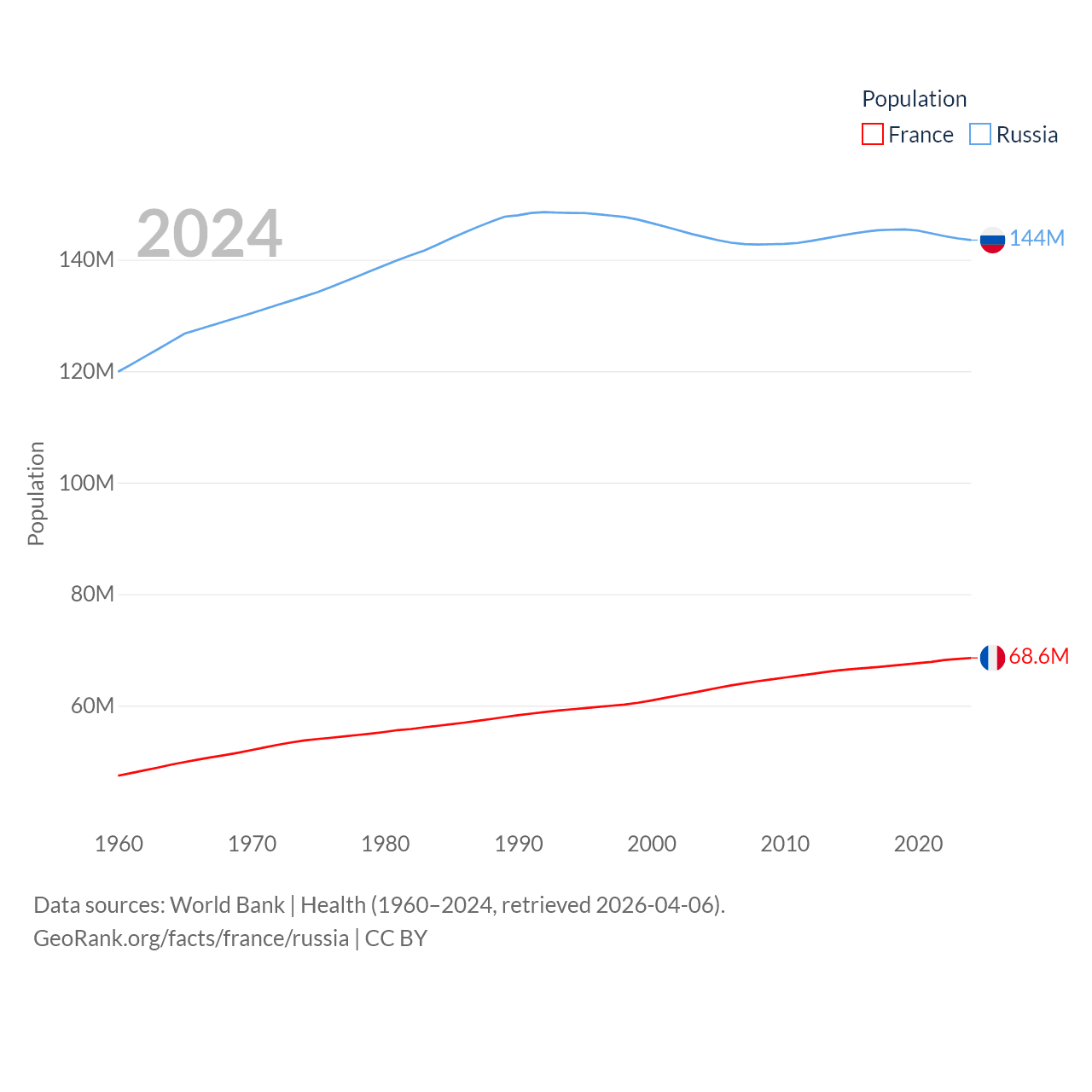 France has a population of 68.6M (ranked 23/197), compared with 144M in Russia (ranked 9/197). France's land area is 208,090 sq mi versus 6,323,145 sq mi for Russia (ranked 48th vs. 1st).