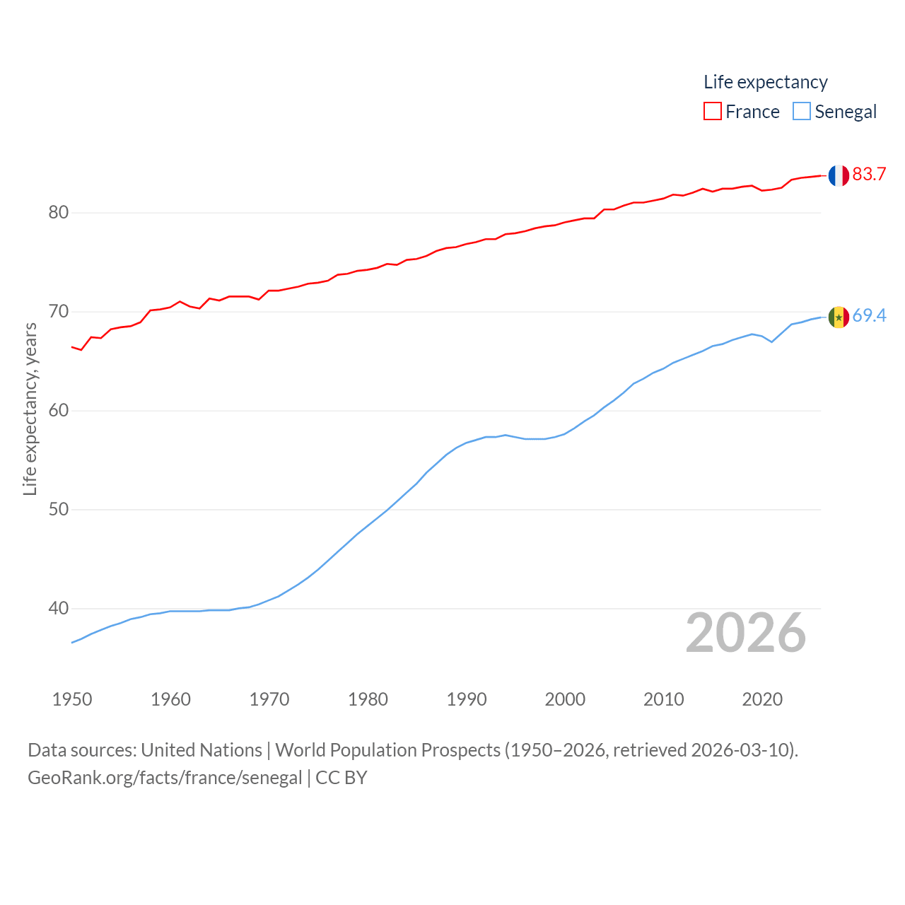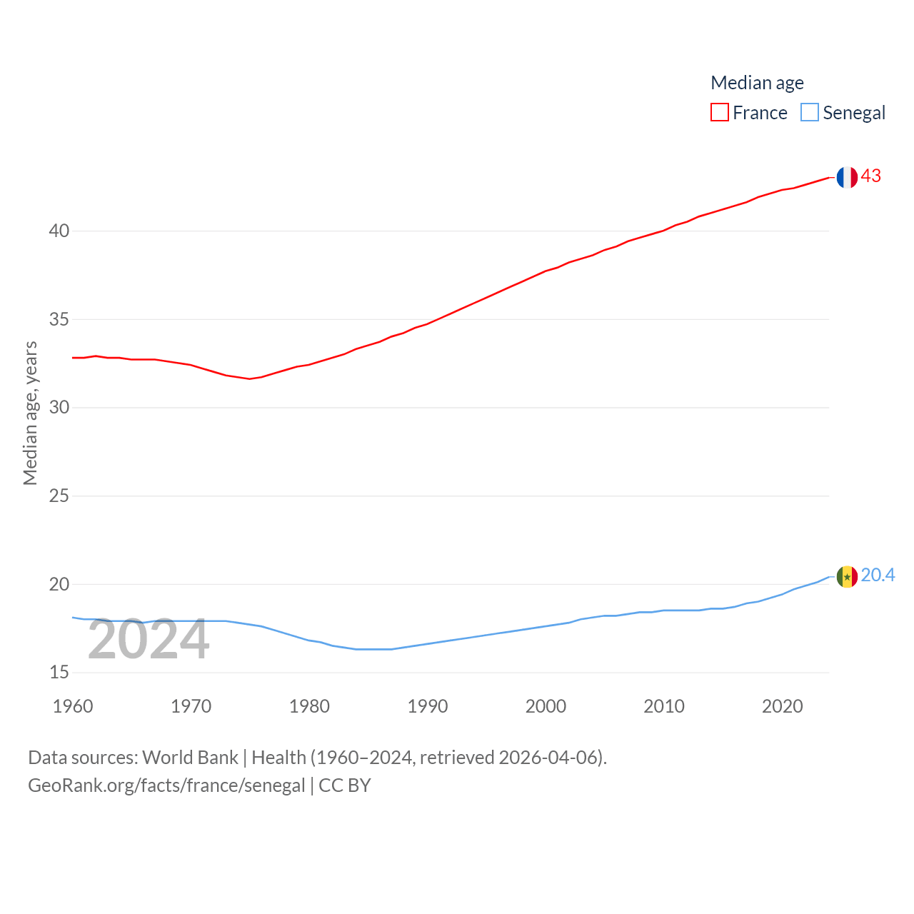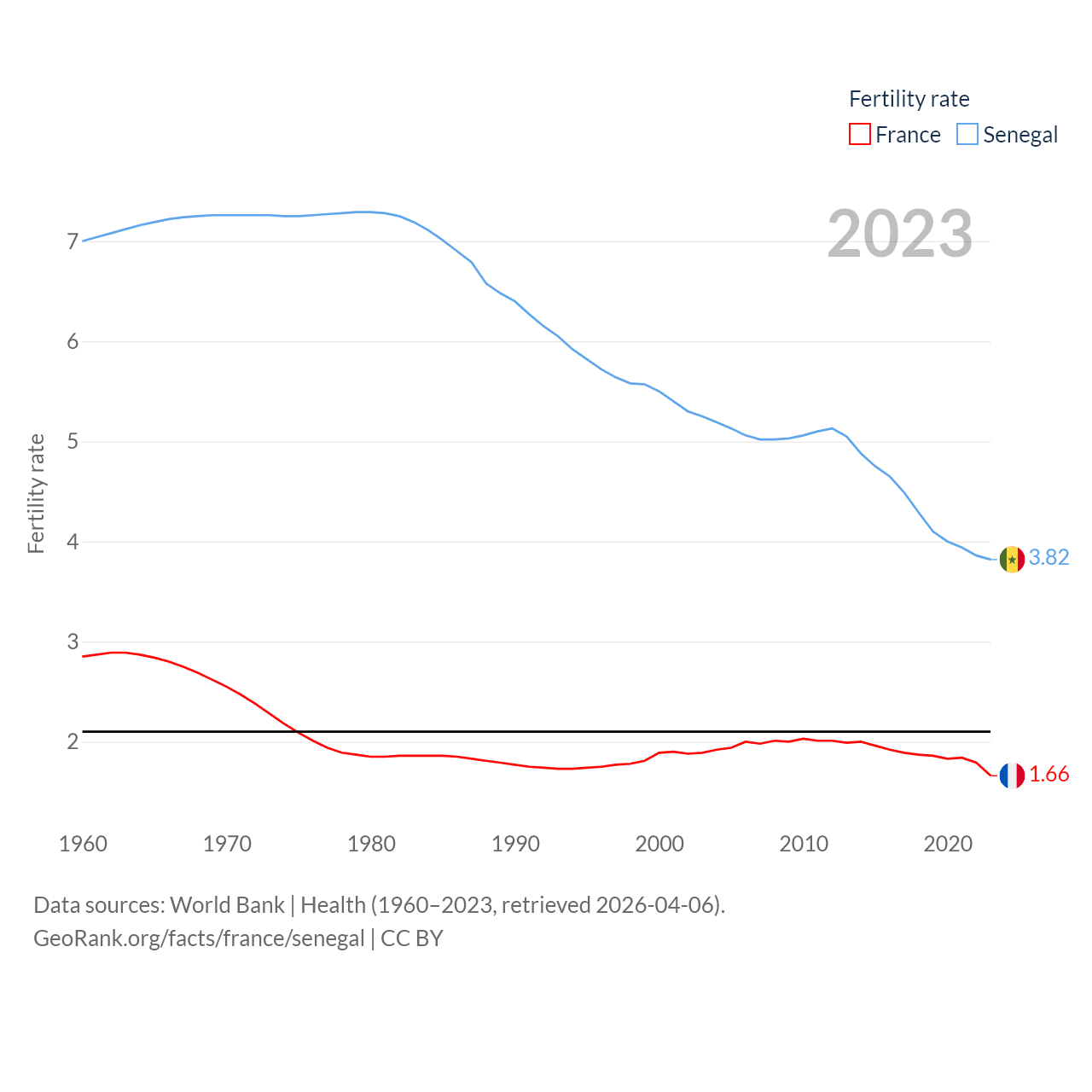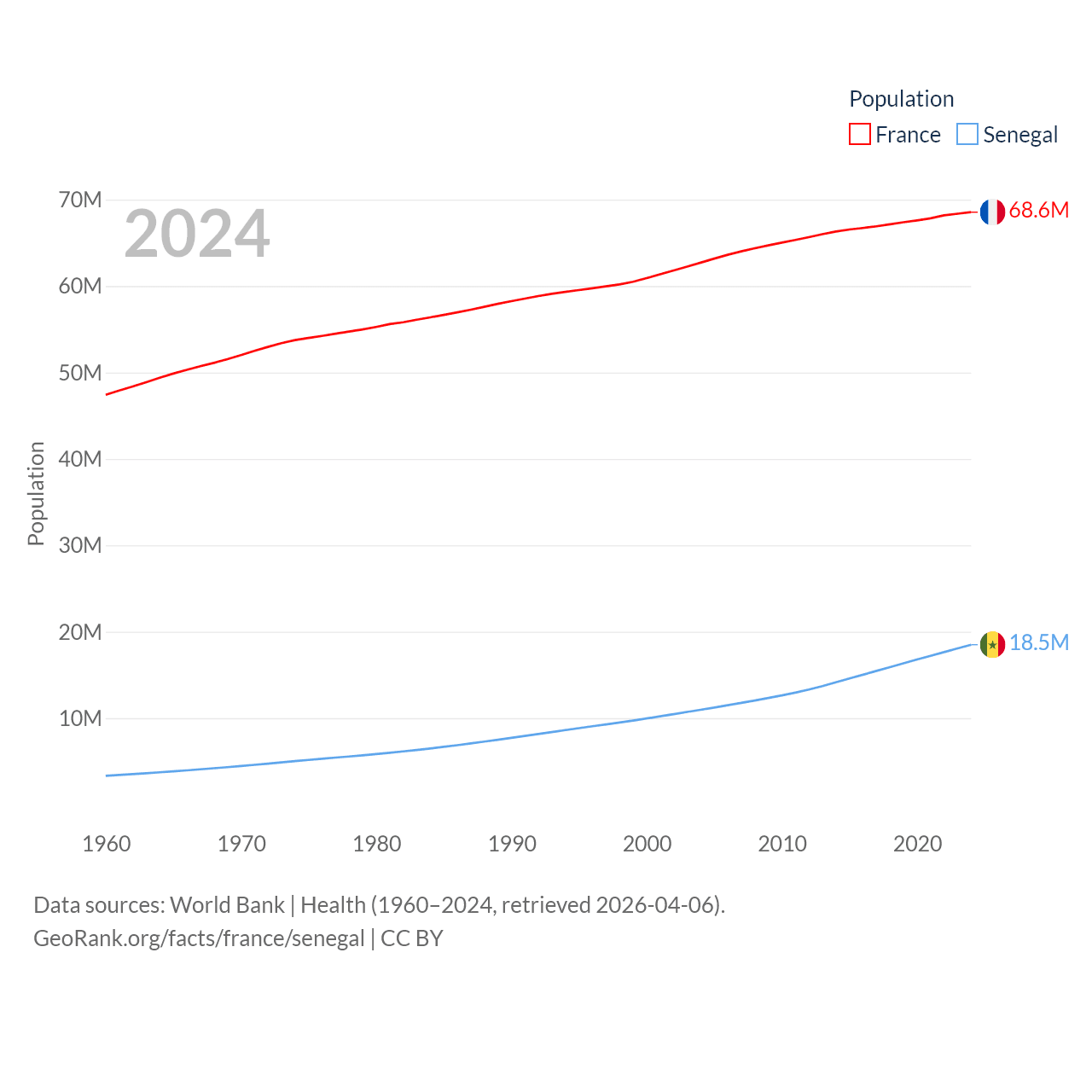 France has a population of 68.6M (ranked 23/197), compared with 18.5M in Senegal (ranked 69/197). France's land area is 208,090 sq mi versus 74,336 sq mi for Senegal (ranked 48th vs. 85th).