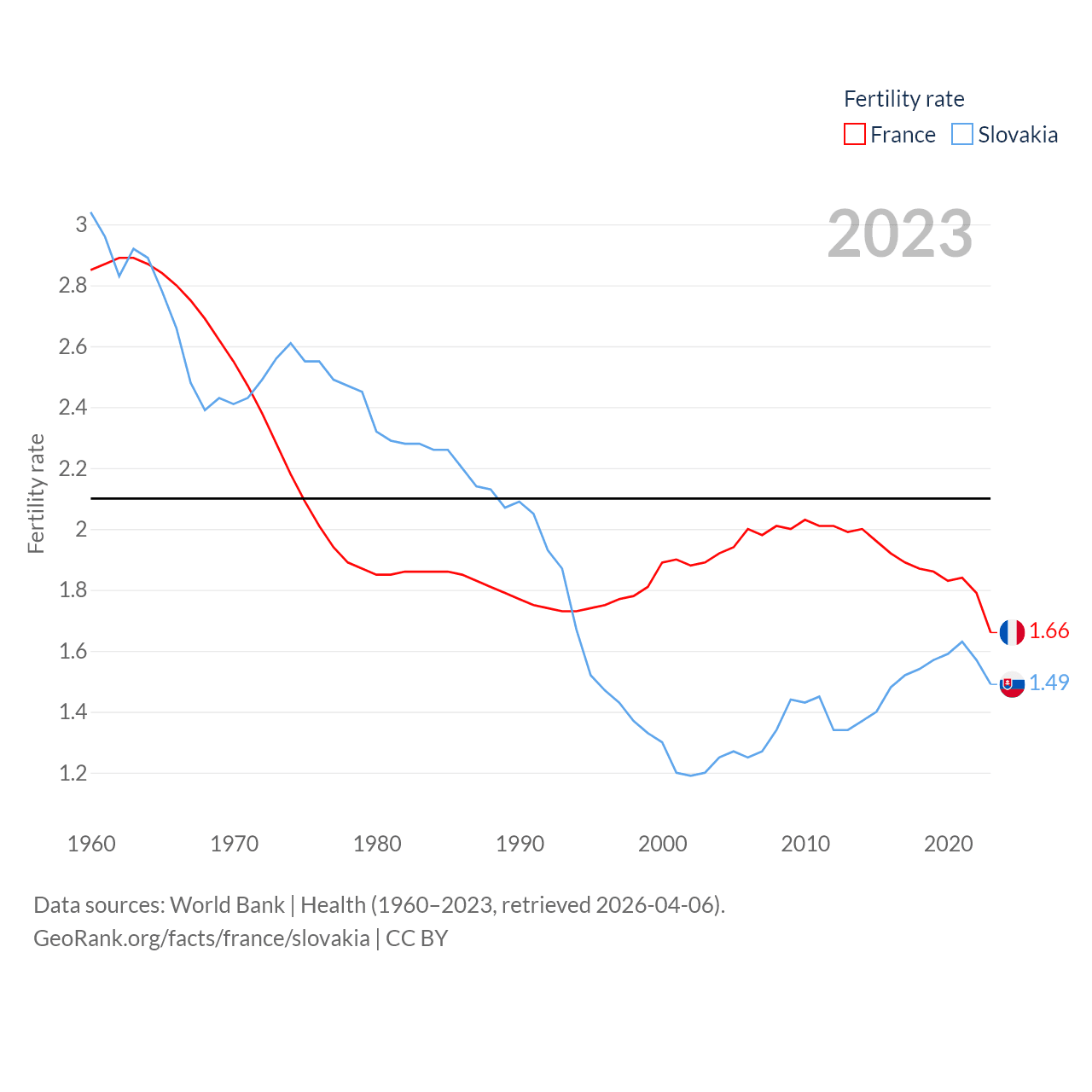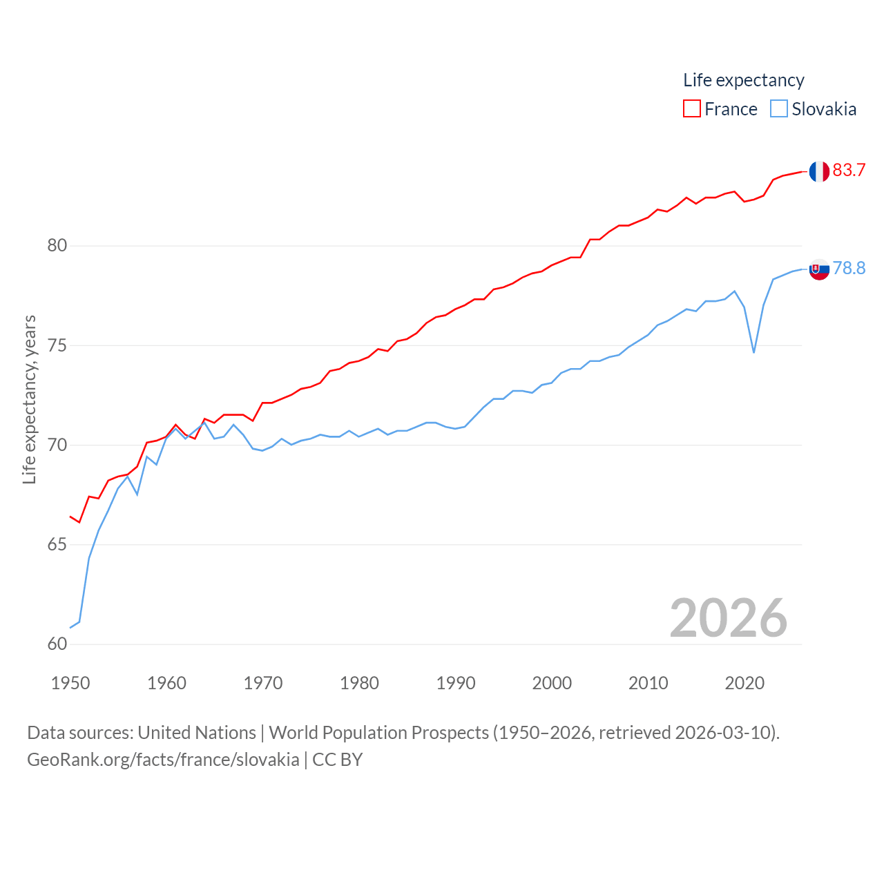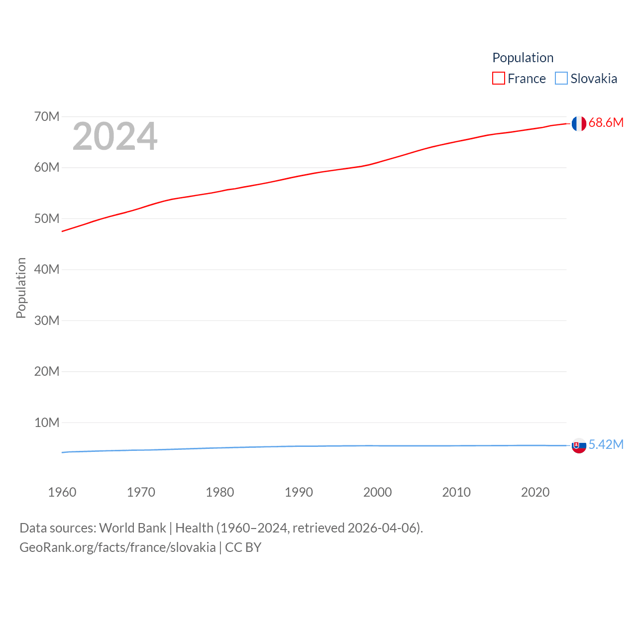 France has a population of 68.6M (ranked 23/197), compared with 5.42M in Slovakia (ranked 119/197). France's land area is 208,090 sq mi versus 18,564 sq mi for Slovakia (ranked 48th vs. 128th).