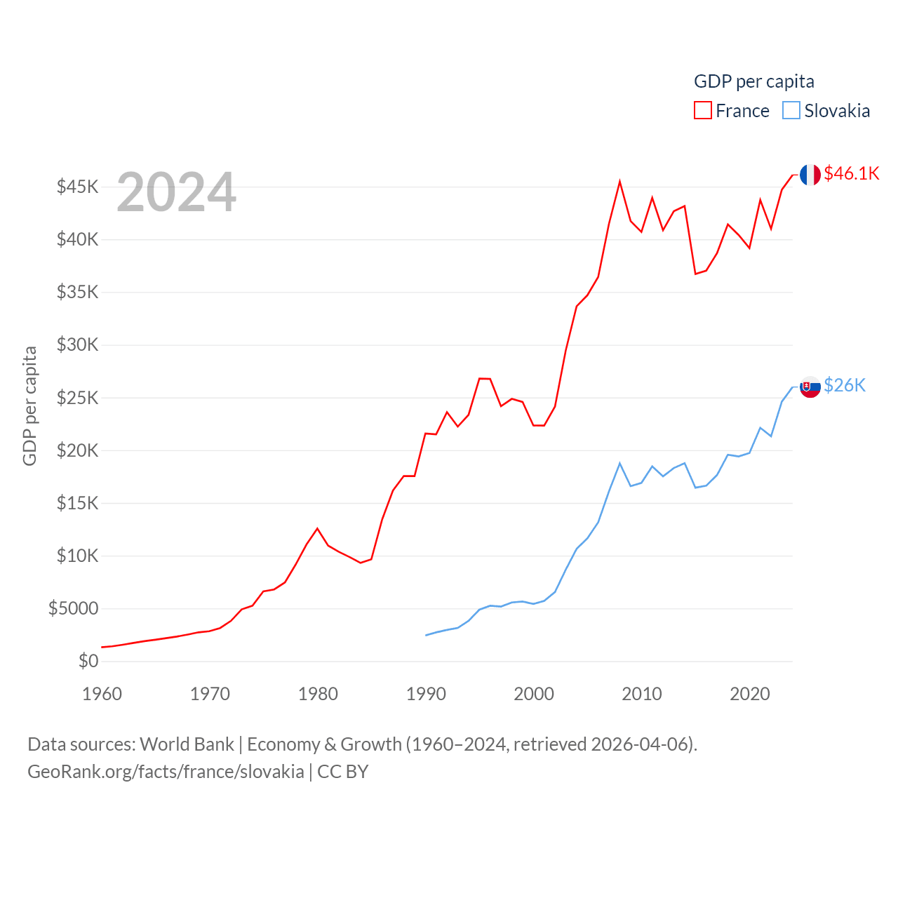 By GDP, France ranks 7/197 ($3.16T) and Slovakia ranks 61/197 ($141B). By GDP per capita, France ranks 27/197 ($46,103), while Slovakia ranks 47/197 ($25,993).