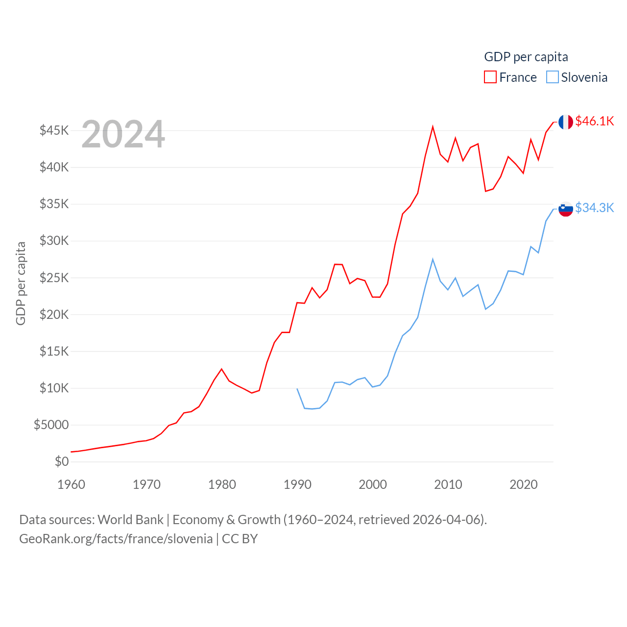By GDP, France ranks 7/197 ($3.16T) and Slovenia ranks 86/197 ($73B). By GDP per capita, France ranks 27/197 ($46,103), while Slovenia ranks 34/197 ($34,301).