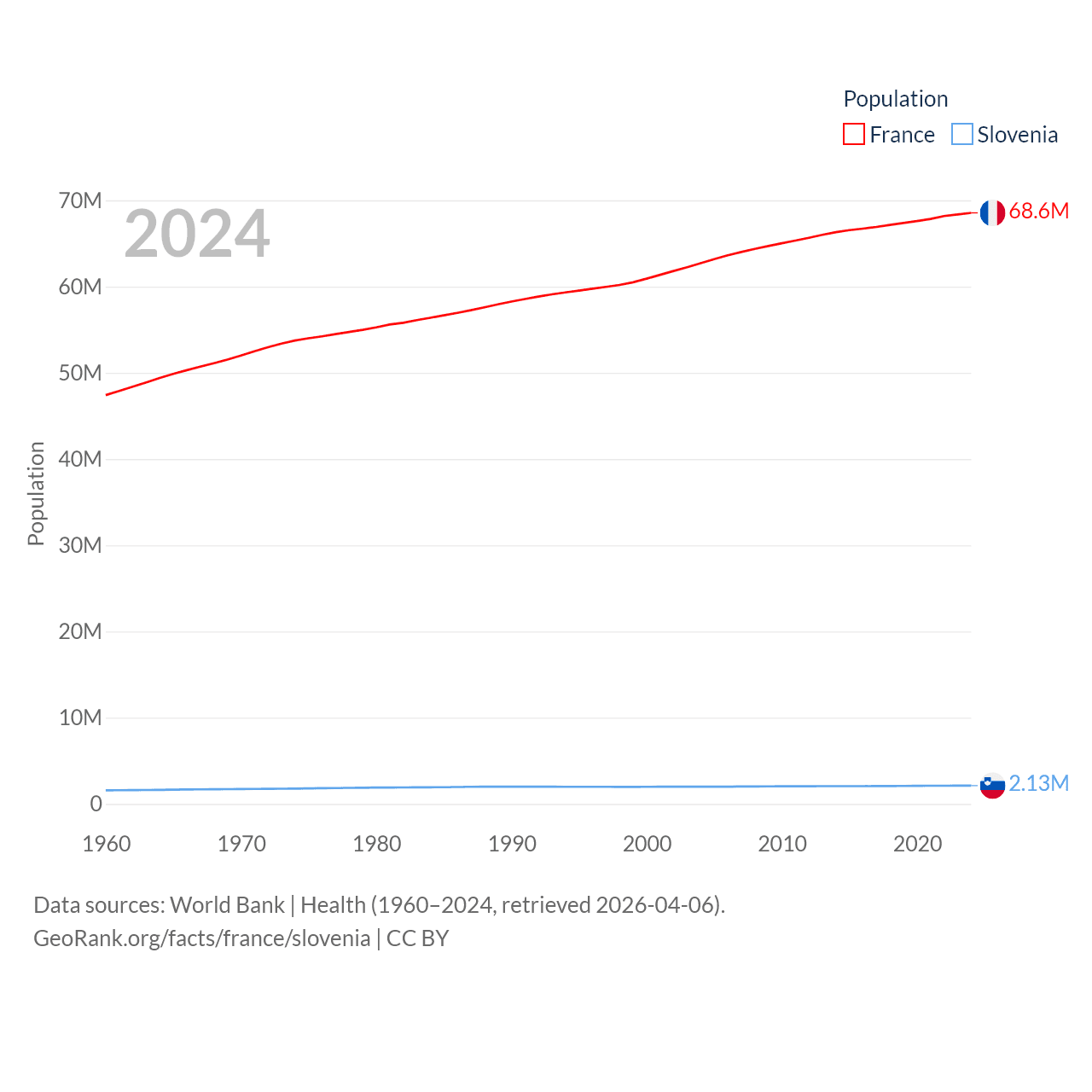 France has a population of 68.6M (ranked 23/197), compared with 2.13M in Slovenia (ranked 147/197). France's land area is 208,090 sq mi versus 7,774 sq mi for Slovenia (ranked 48th vs. 151st).