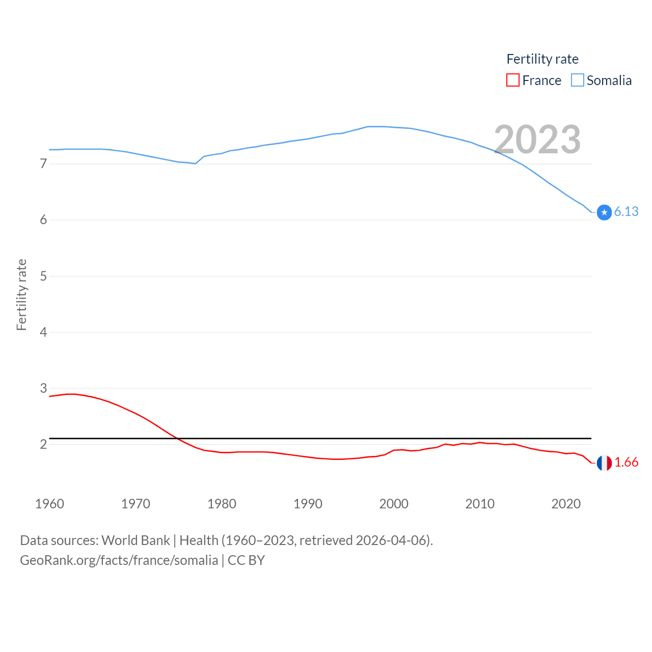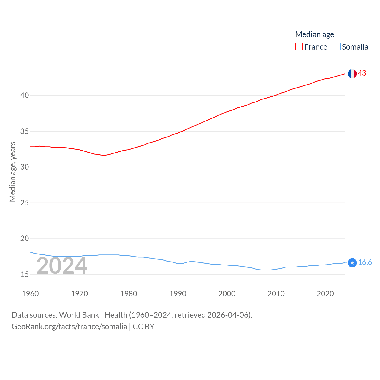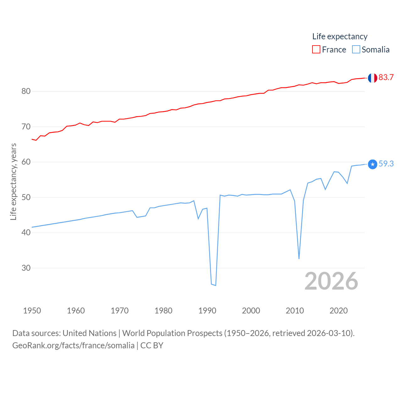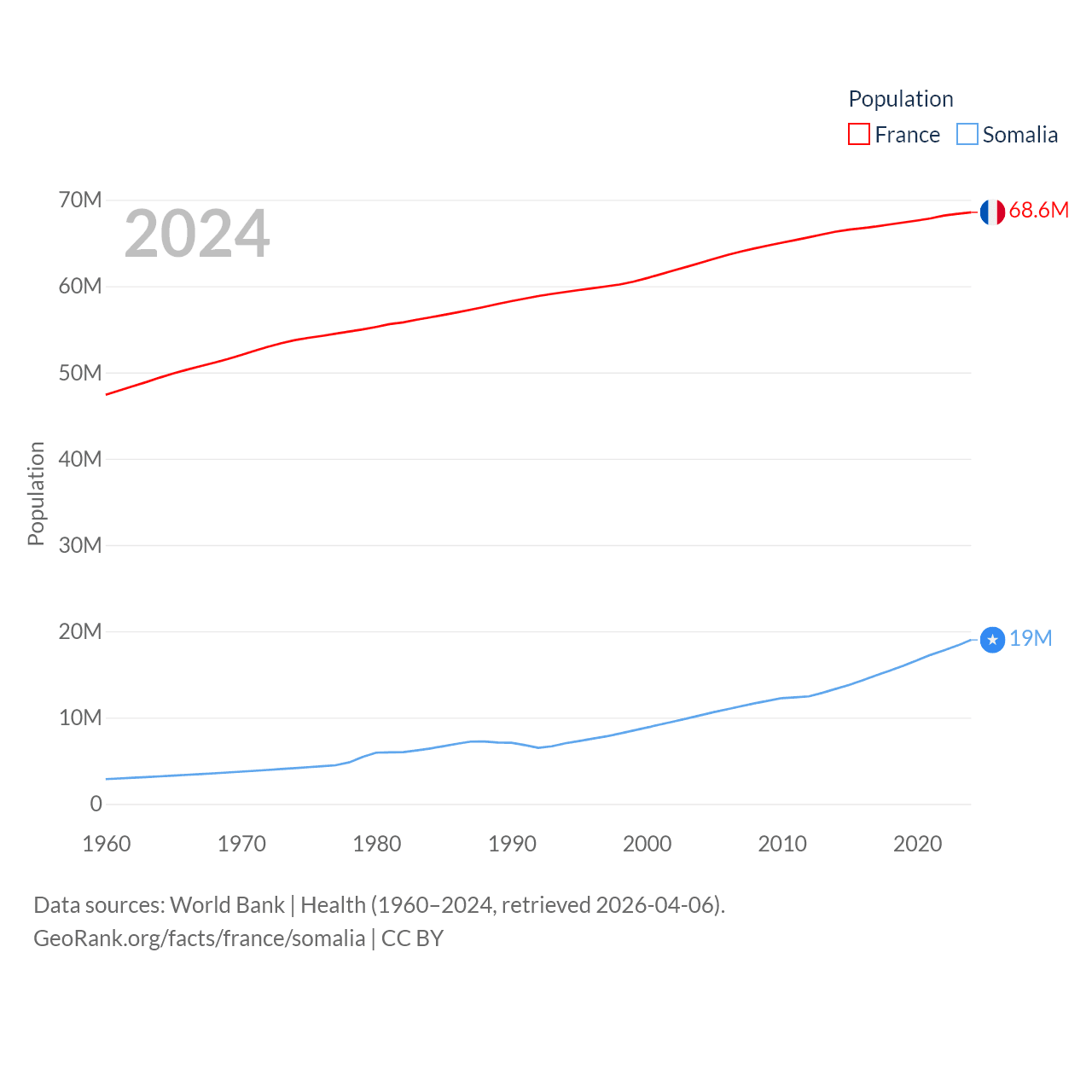 France has a population of 68.6M (ranked 23/197), compared with 19M in Somalia (ranked 68/197). France's land area is 208,090 sq mi versus 242,217 sq mi for Somalia (ranked 48th vs. 42nd).
