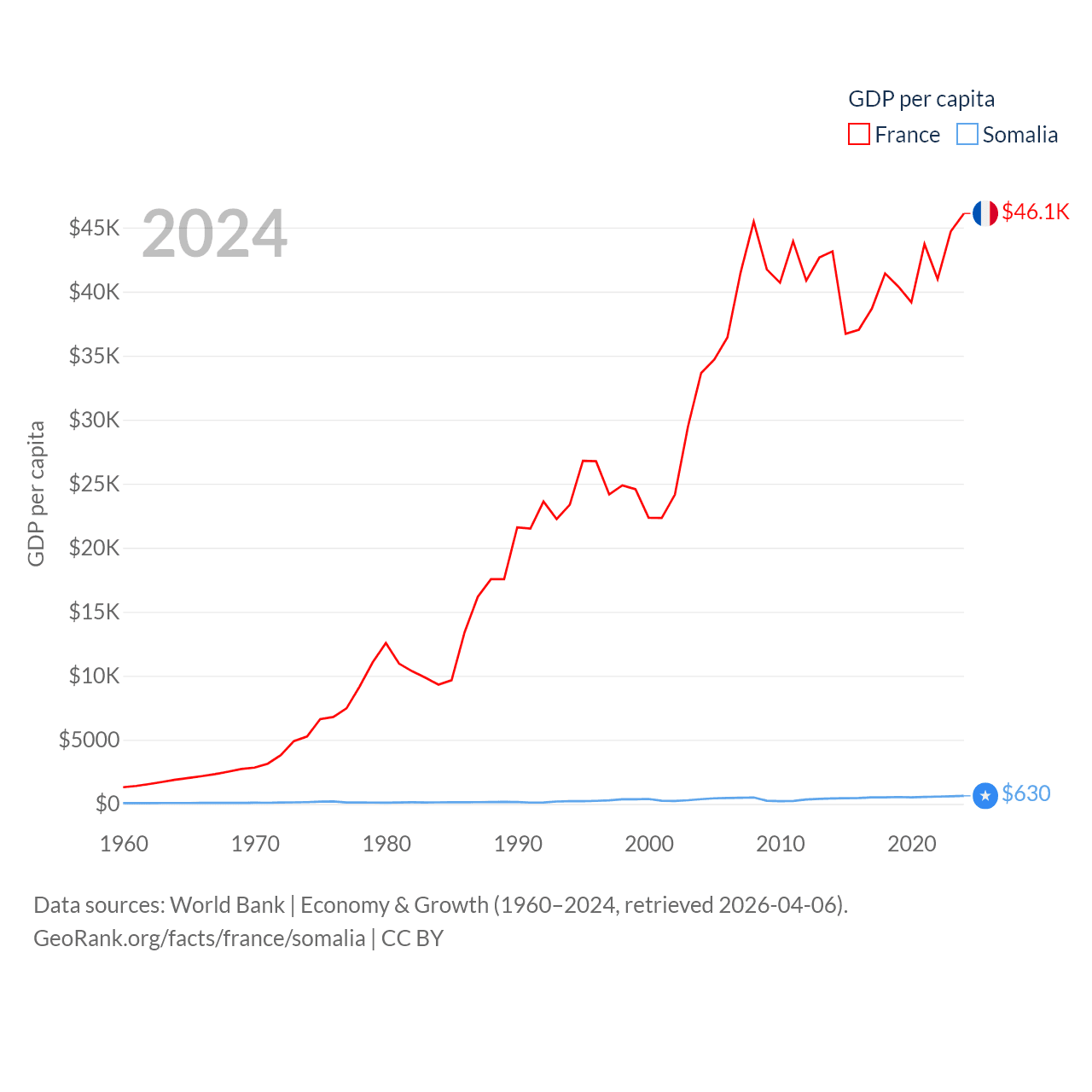 By GDP, France ranks 7/197 ($3.16T) and Somalia ranks 150/197 ($12B). By GDP per capita, France ranks 27/197 ($46,103), while Somalia ranks 192/197 ($630).