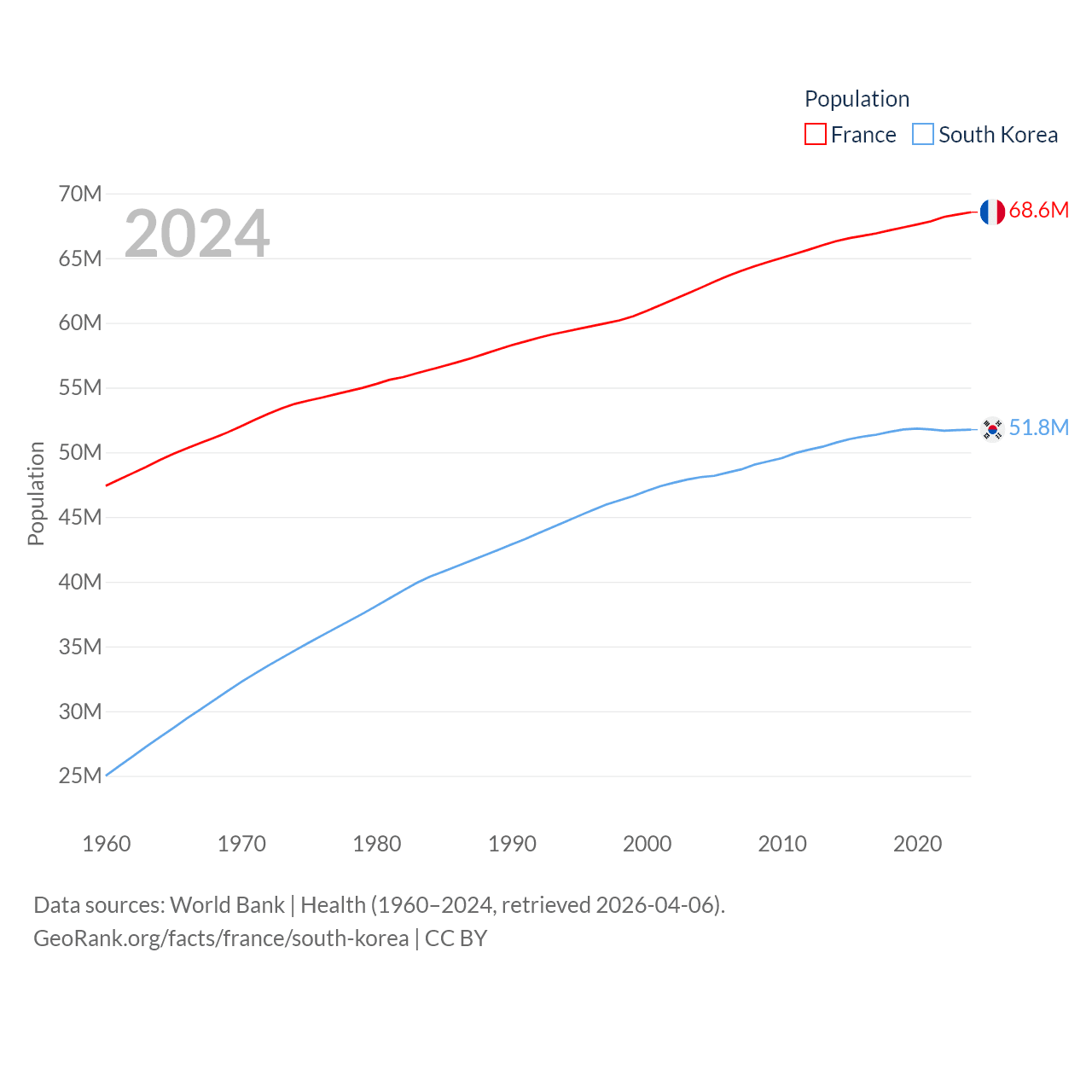 France has a population of 68.6M (ranked 23/197), compared with 51.8M in South Korea (ranked 29/197). France's land area is 208,090 sq mi versus 37,684 sq mi for South Korea (ranked 48th vs. 105th).