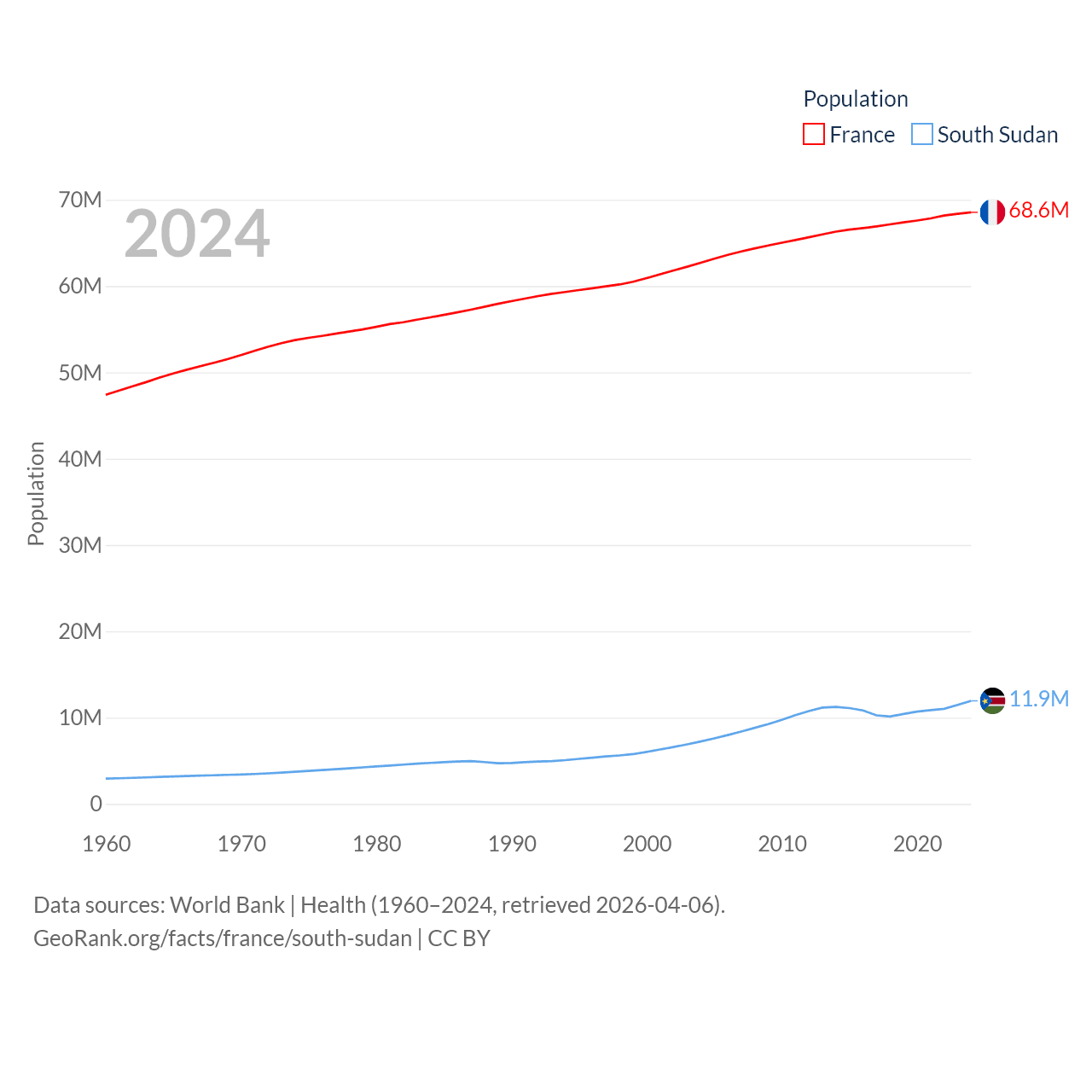 France has a population of 68.6M (ranked 23/197), compared with 11.9M in South Sudan (ranked 81/197). France's land area is 208,090 sq mi versus 243,990 sq mi for South Sudan (ranked 48th vs. 41st).