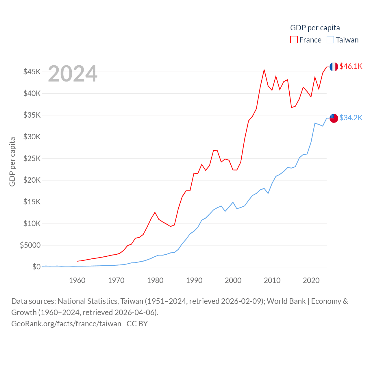 By GDP, France ranks 7/197 ($3.16T) and Taiwan ranks 22/197 ($802B). By GDP per capita, France ranks 27/197 ($46,103), while Taiwan ranks 35/197 ($34,238).