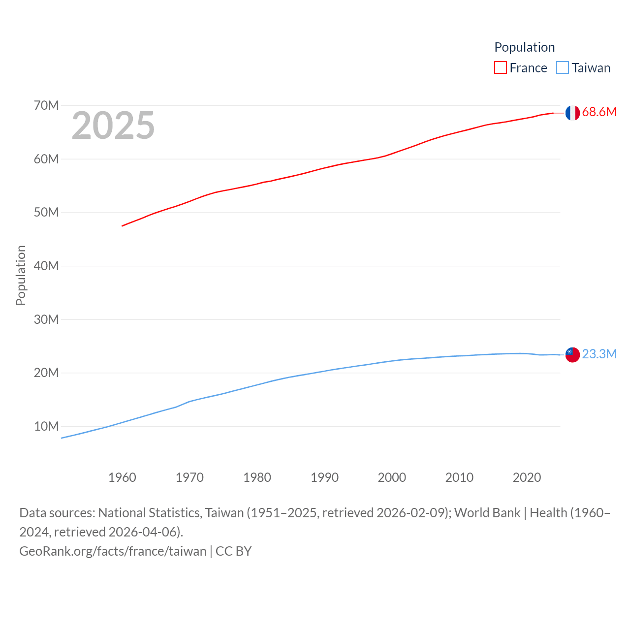 France has a population of 68.6M (ranked 23/197), compared with 23.3M in Taiwan (ranked 60/197). France's land area is 208,090 sq mi versus 13,976 sq mi for Taiwan (ranked 48th vs. 133rd).