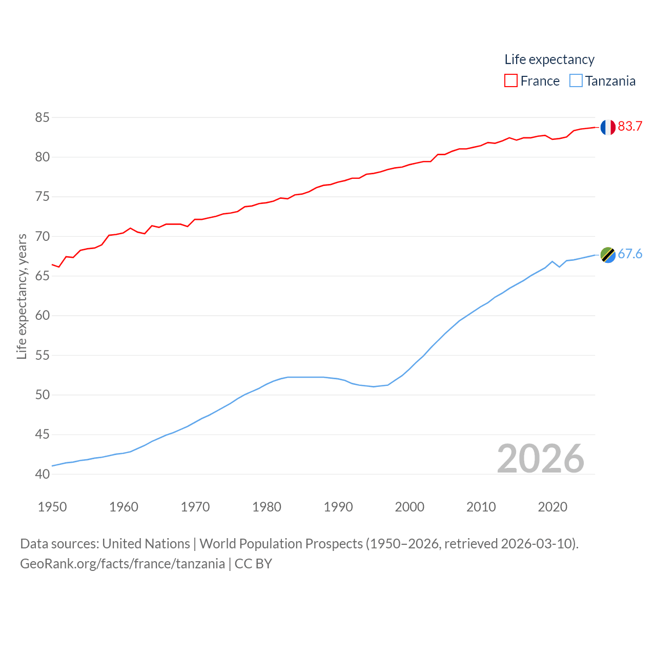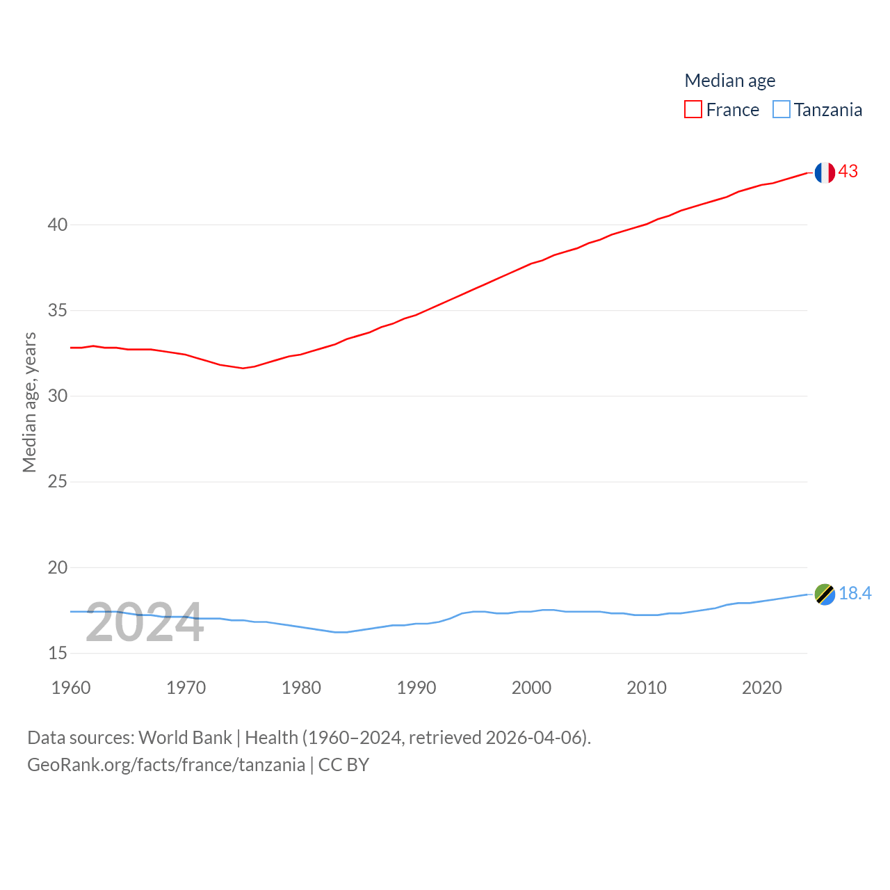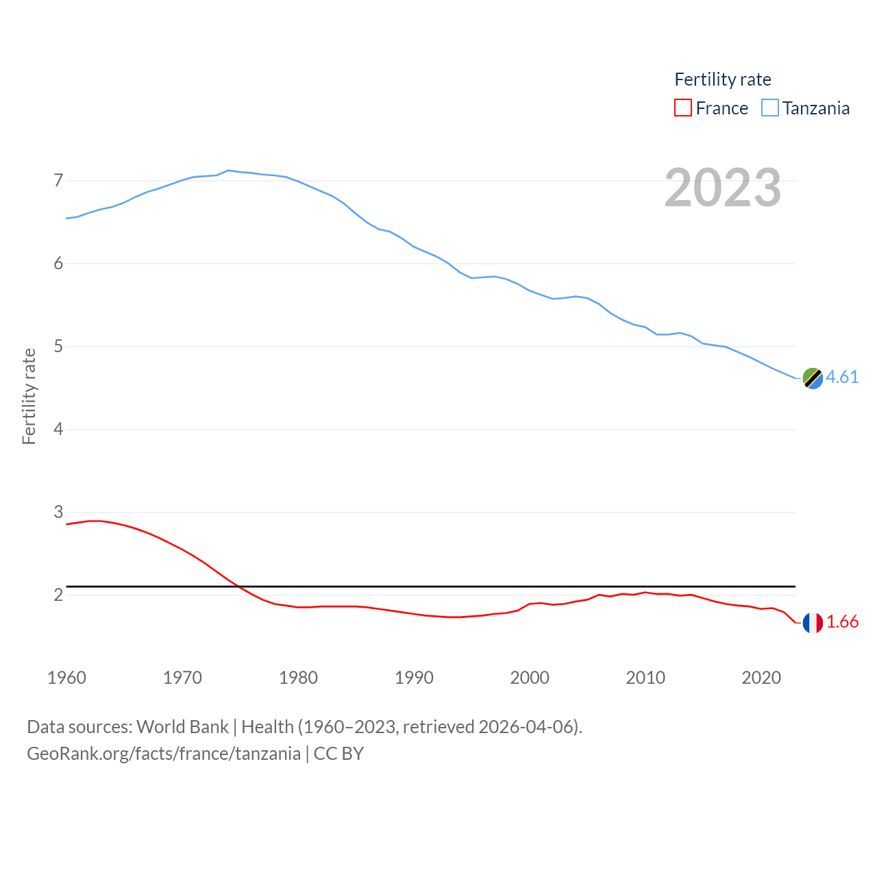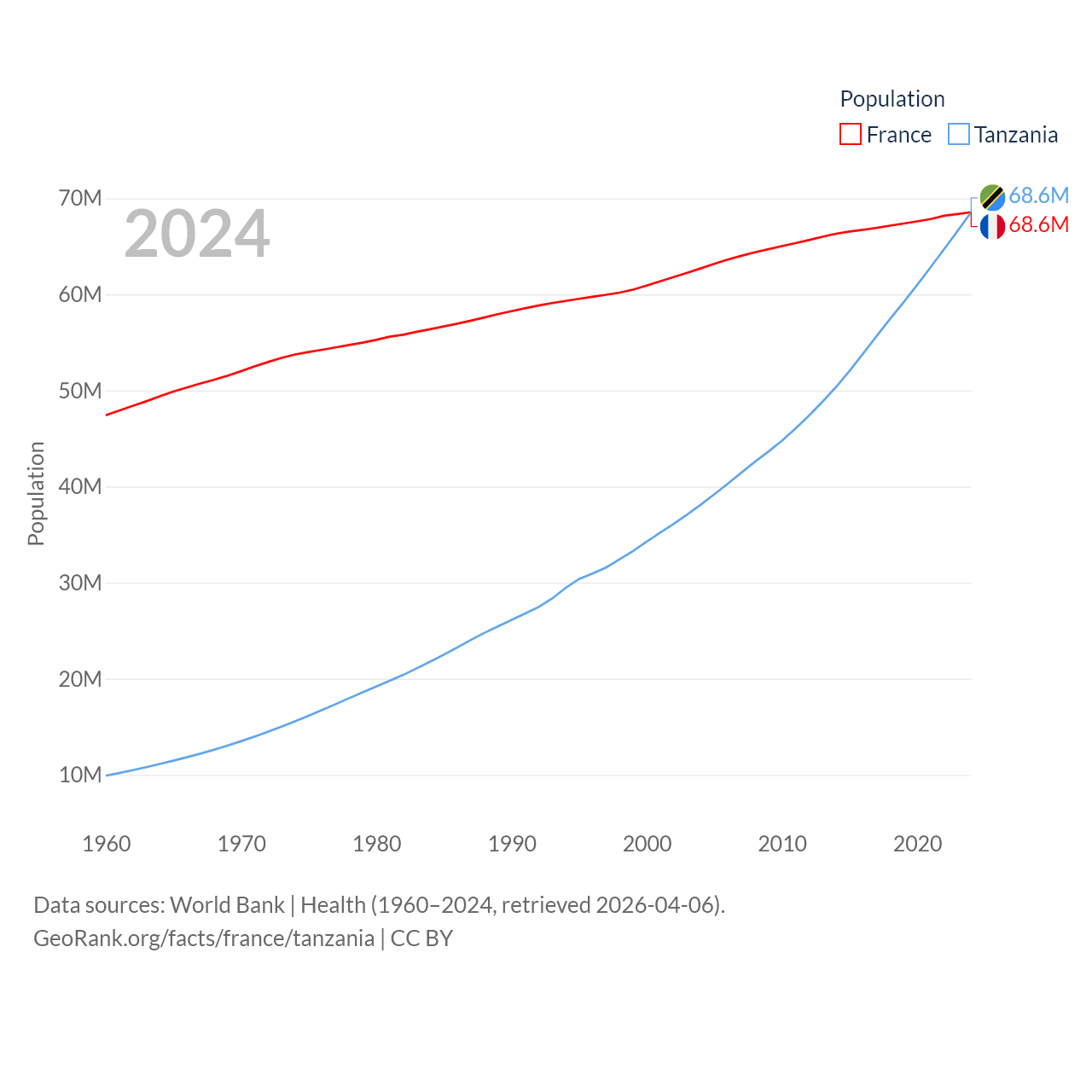 France has a population of 68.6M (ranked 23/197), compared with 68.6M in Tanzania (ranked 22/197). France's land area is 208,090 sq mi versus 342,009 sq mi for Tanzania (ranked 48th vs. 31st).