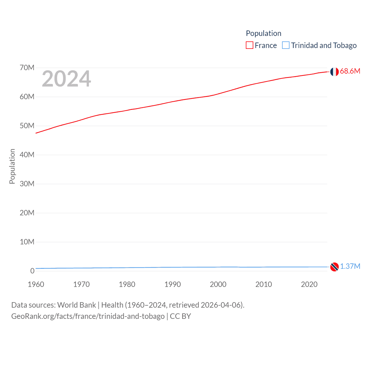 France has a population of 68.6M (ranked 23/197), compared with 1.37M in Trinidad and Tobago (ranked 154/197). France's land area is 208,090 sq mi versus 1,981 sq mi for Trinidad and Tobago (ranked 48th vs. 166th).