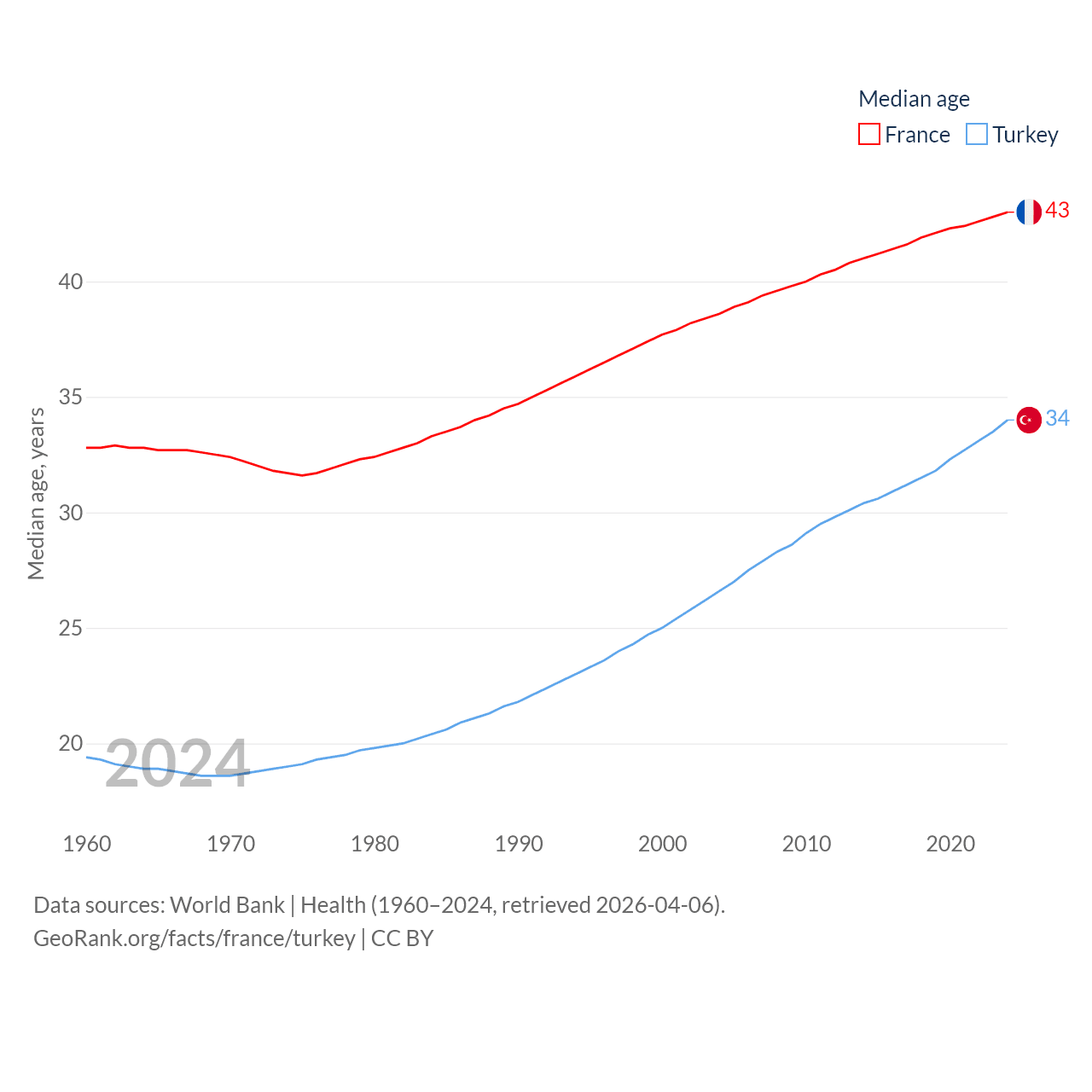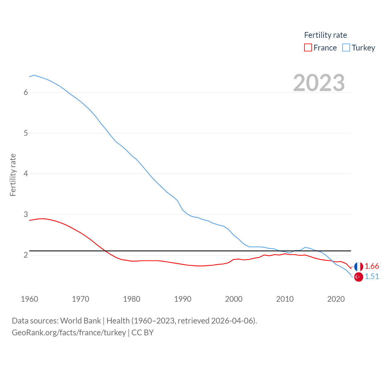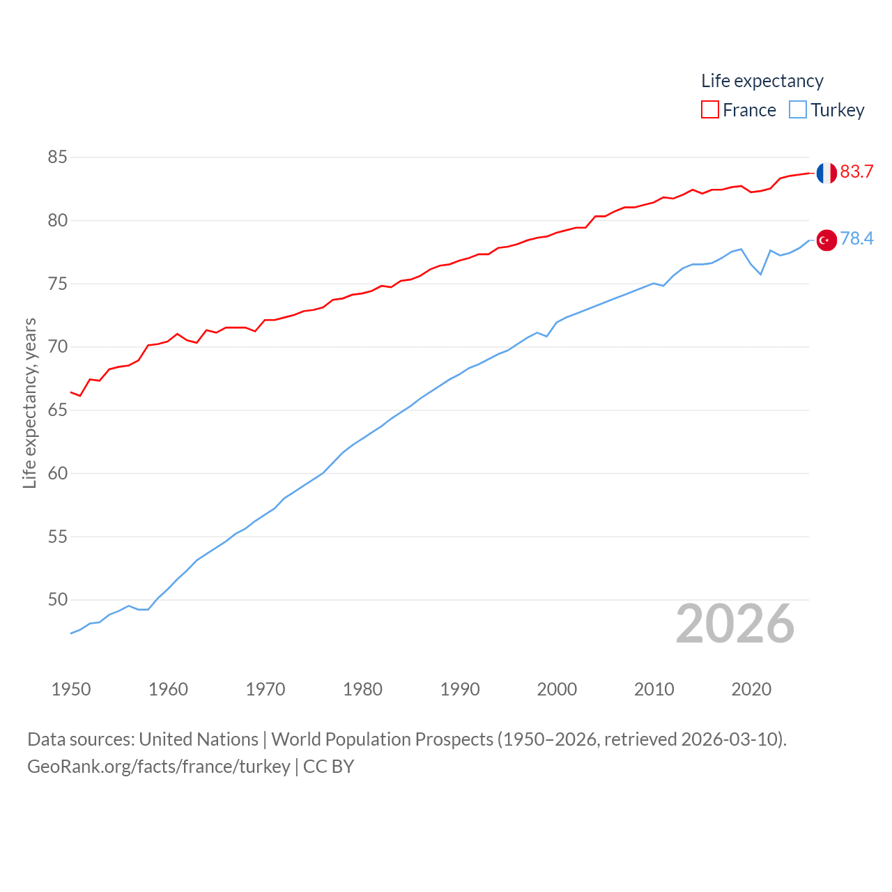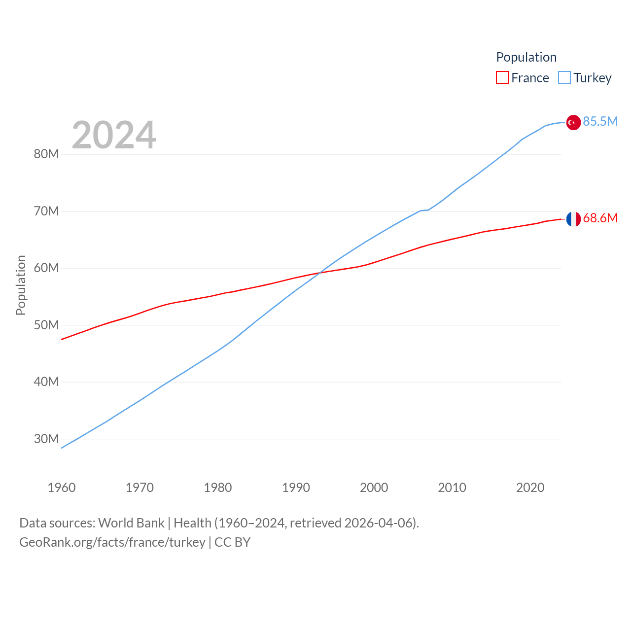 France has a population of 68.6M (ranked 23/197), compared with 85.5M in Turkey (ranked 18/197). France's land area is 208,090 sq mi versus 297,156 sq mi for Turkey (ranked 48th vs. 36th).