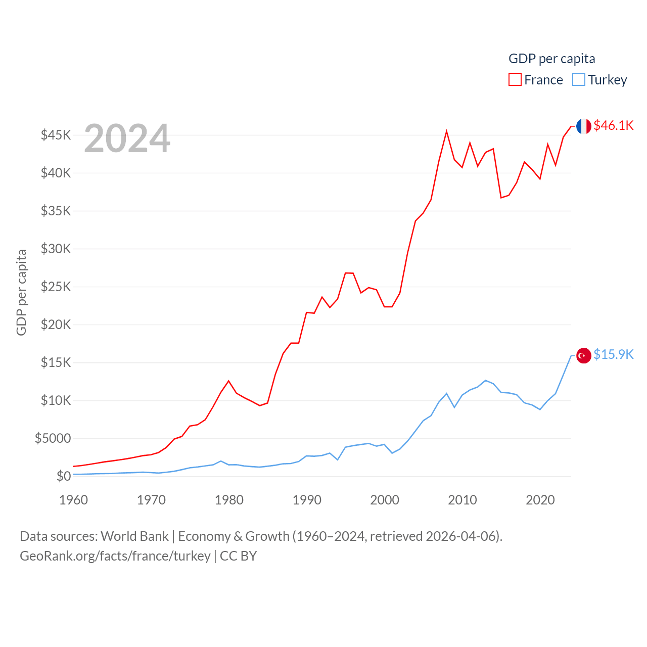 By GDP, France ranks 7/197 ($3.16T) and Turkey ranks 17/197 ($1.36T). By GDP per capita, France ranks 27/197 ($46,103), while Turkey ranks 66/197 ($15,893).