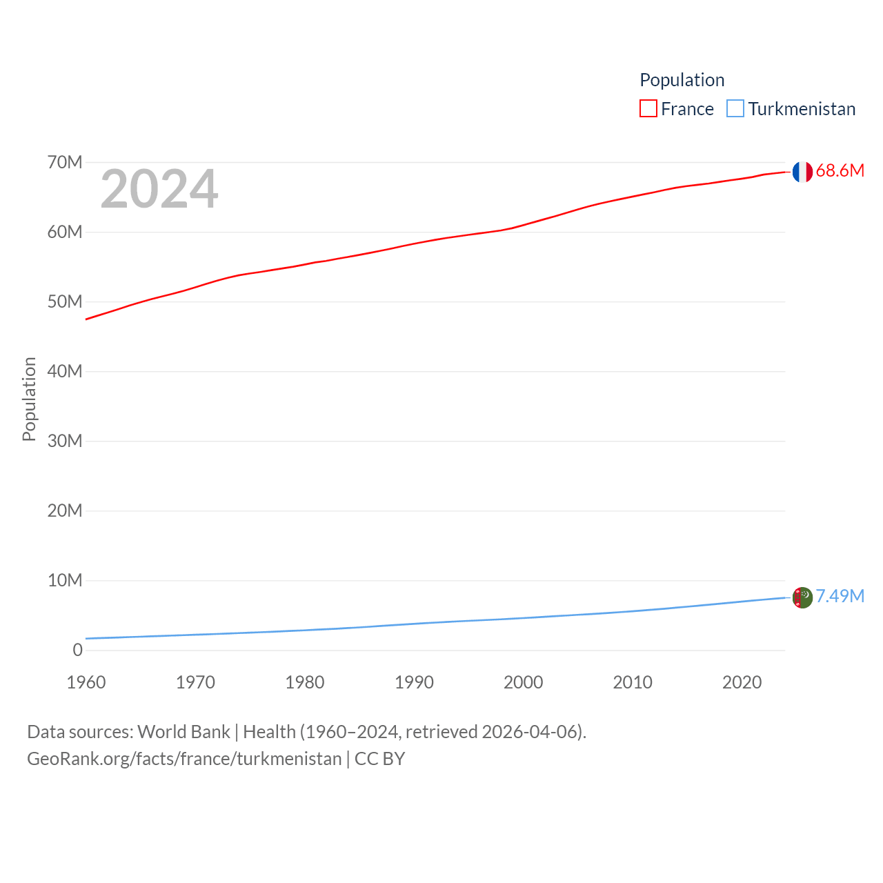 France has a population of 68.6M (ranked 23/197), compared with 7.49M in Turkmenistan (ranked 104/197). France's land area is 208,090 sq mi versus 181,441 sq mi for Turkmenistan (ranked 48th vs. 53rd).