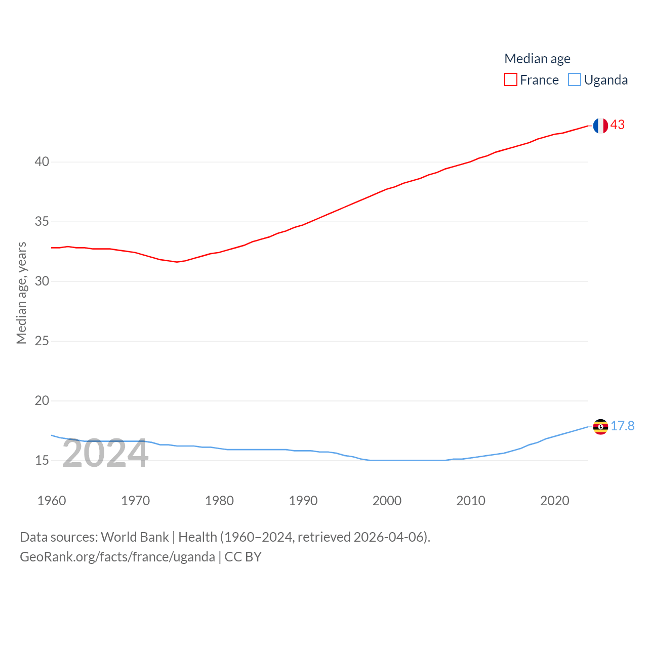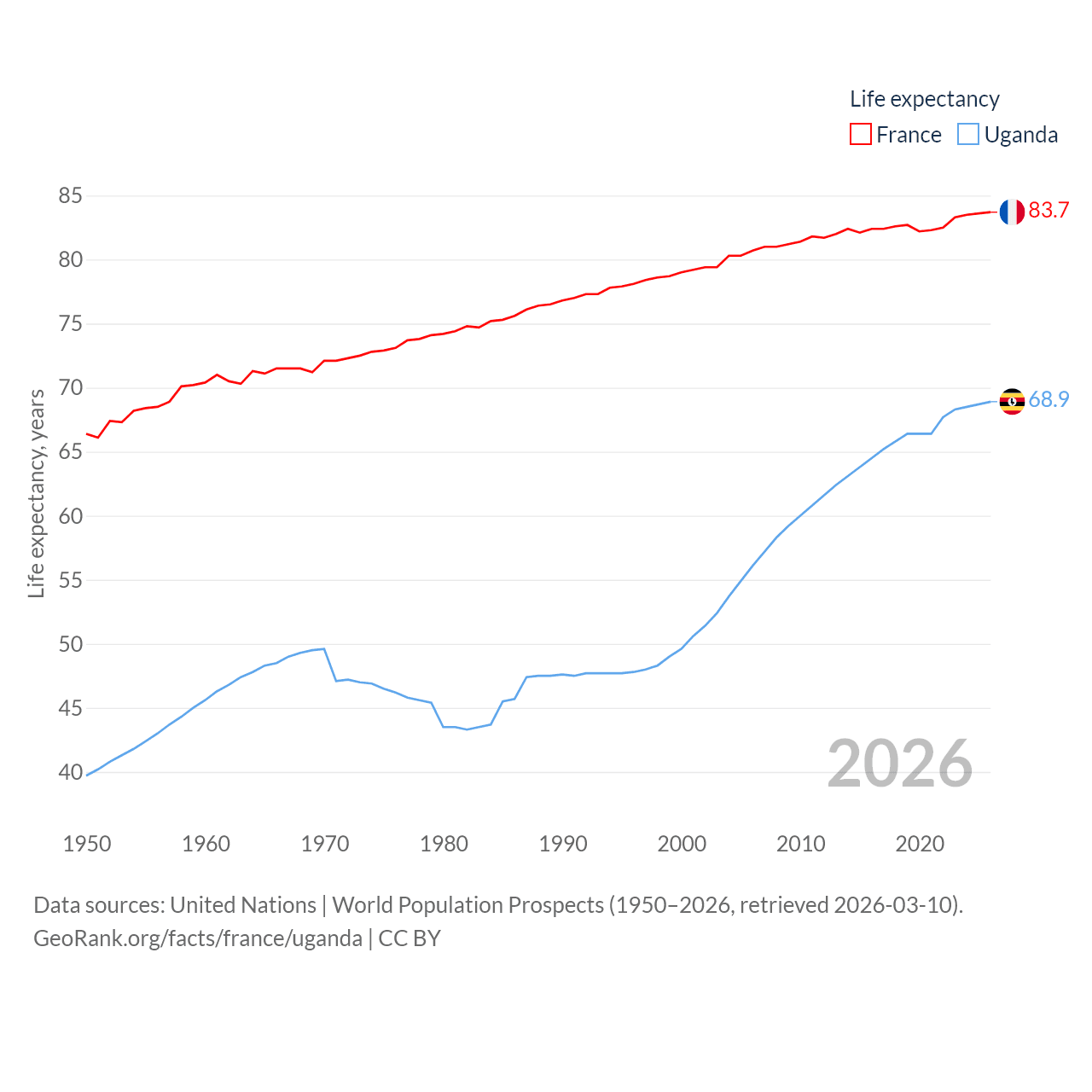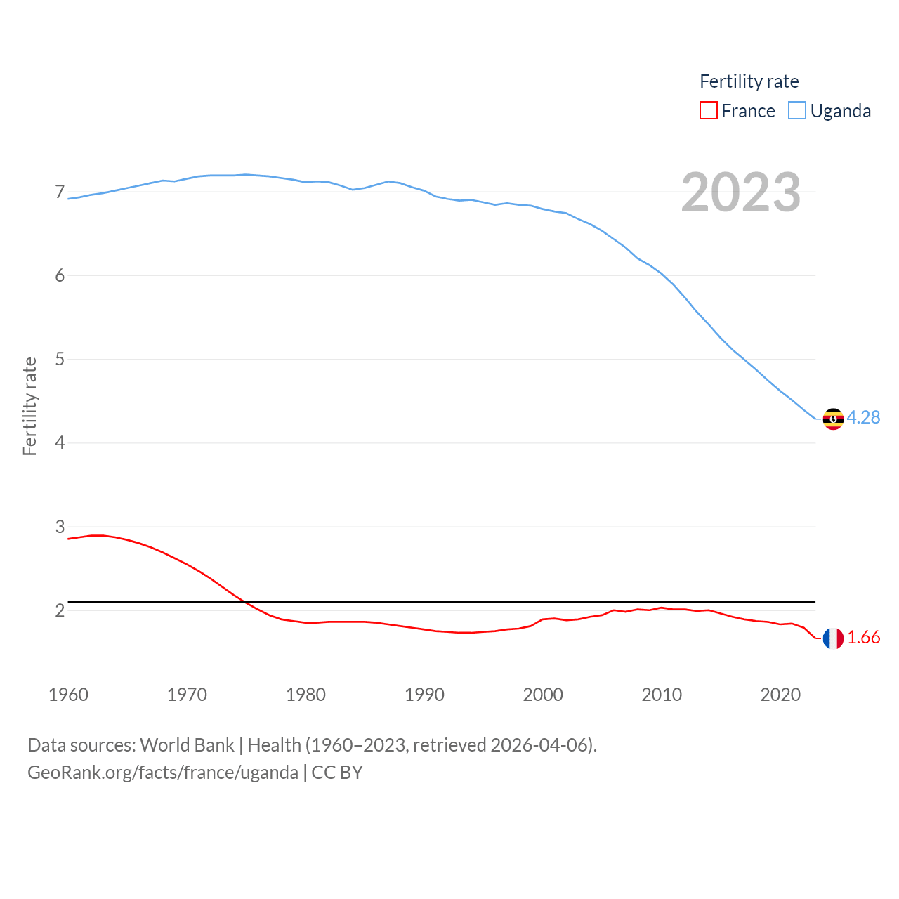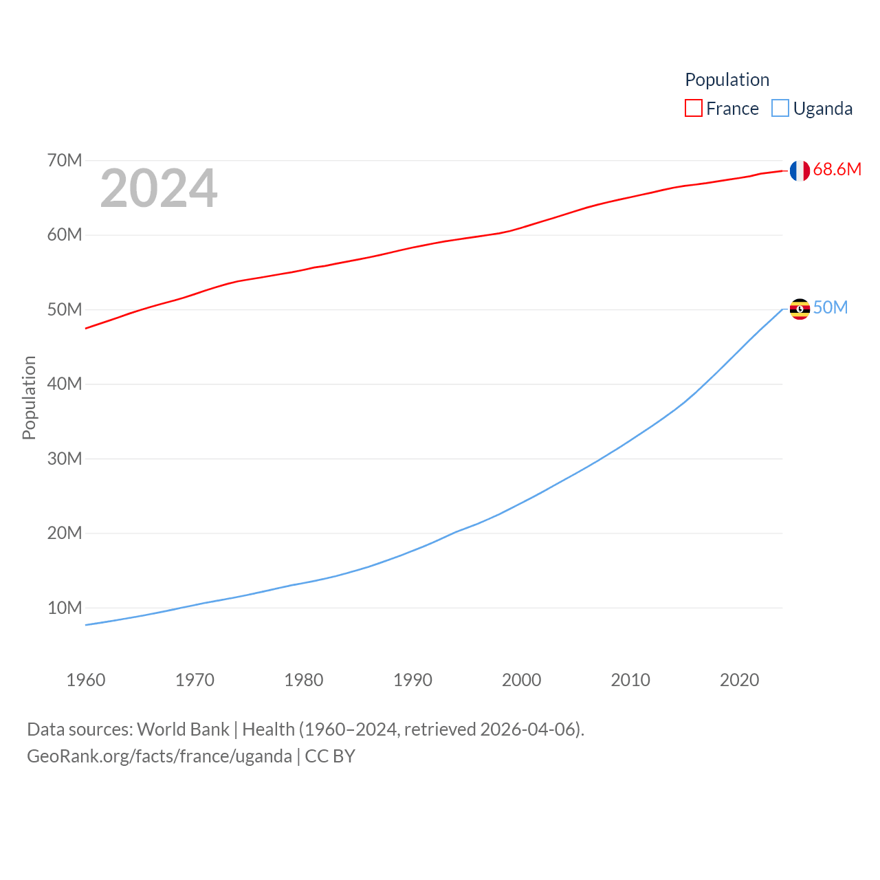 France has a population of 68.6M (ranked 23/197), compared with 50M in Uganda (ranked 31/197). France's land area is 208,090 sq mi versus 77,421 sq mi for Uganda (ranked 48th vs. 84th).