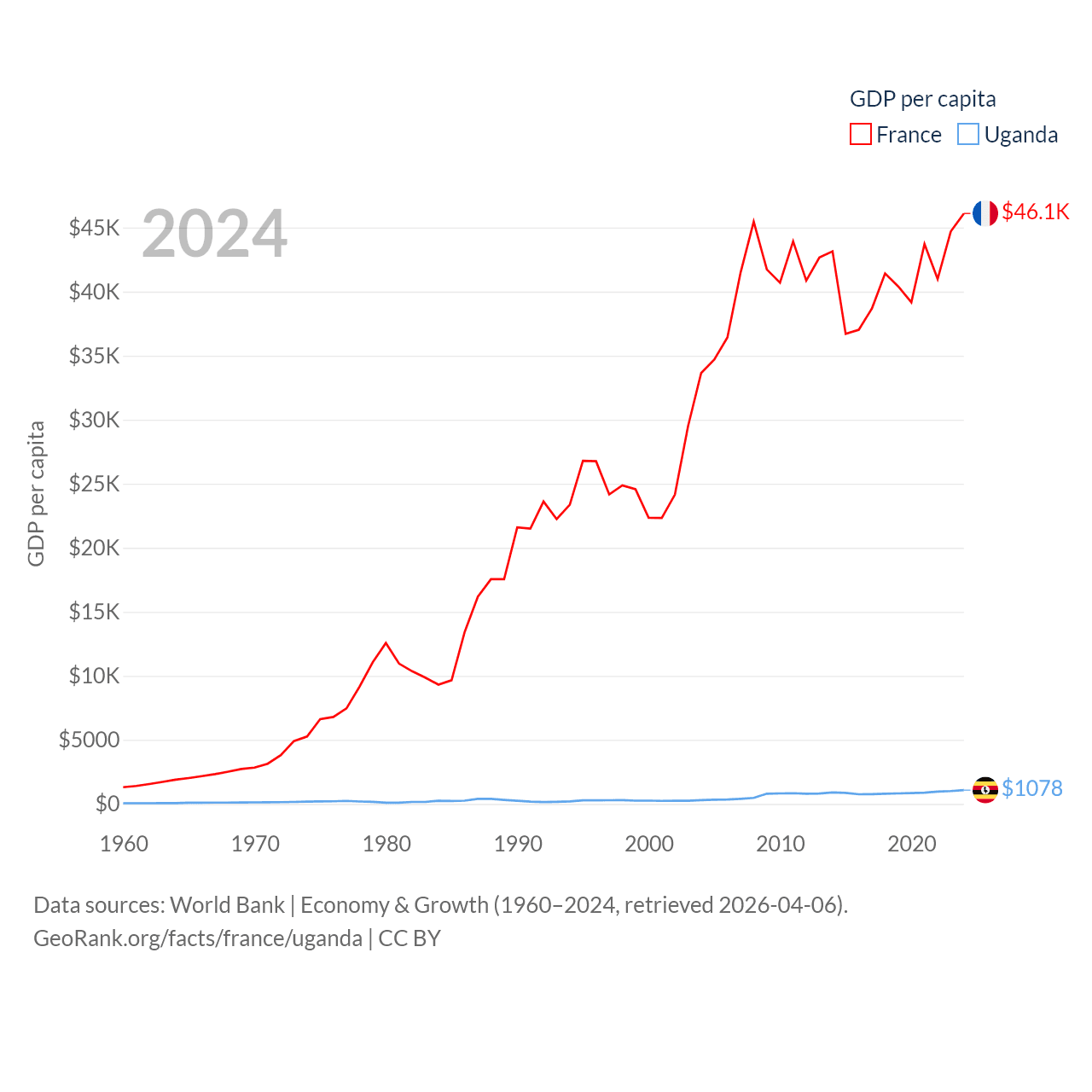 By GDP, France ranks 7/197 ($3.16T) and Uganda ranks 89/197 ($53.9B). By GDP per capita, France ranks 27/197 ($46,103), while Uganda ranks 176/197 ($1,078).
