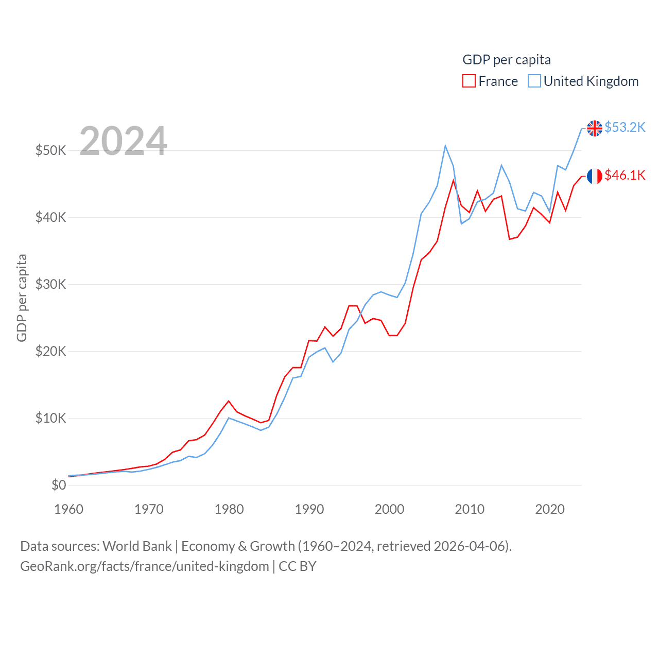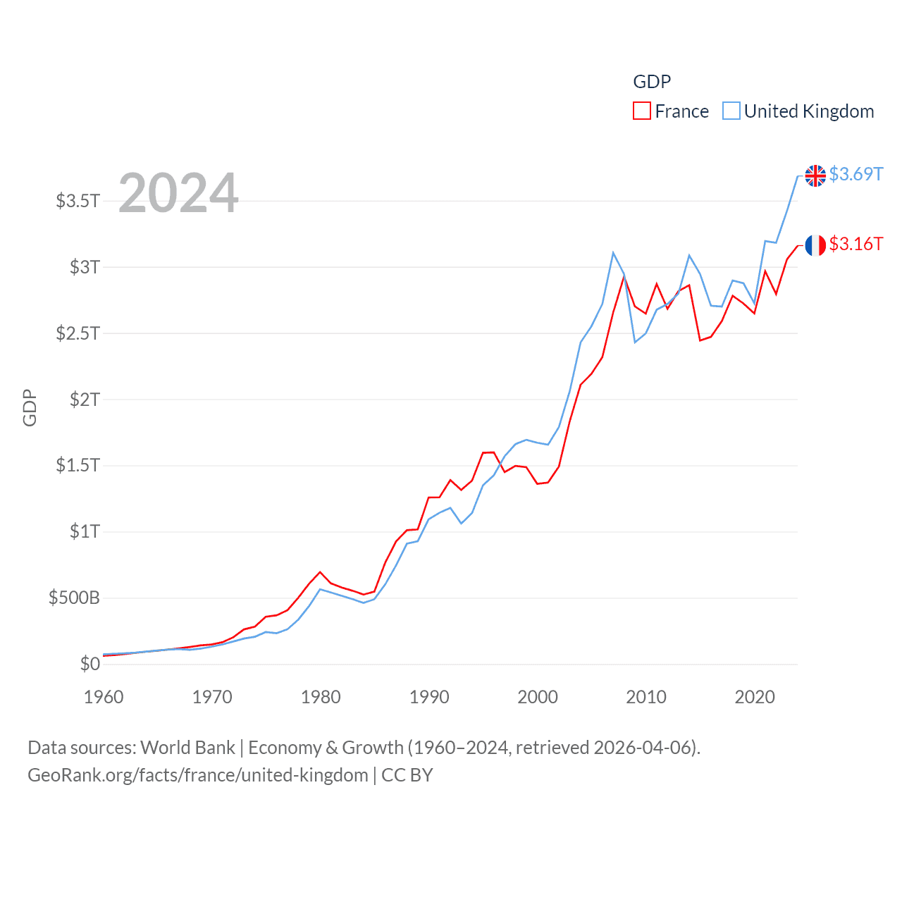 By GDP, France ranks 7/197 ($3.16T) and The United Kingdom ranks 6/197 ($3.69T). By GDP per capita, France ranks 27/197 ($46,103), while The United Kingdom ranks 22/197 ($53,246).