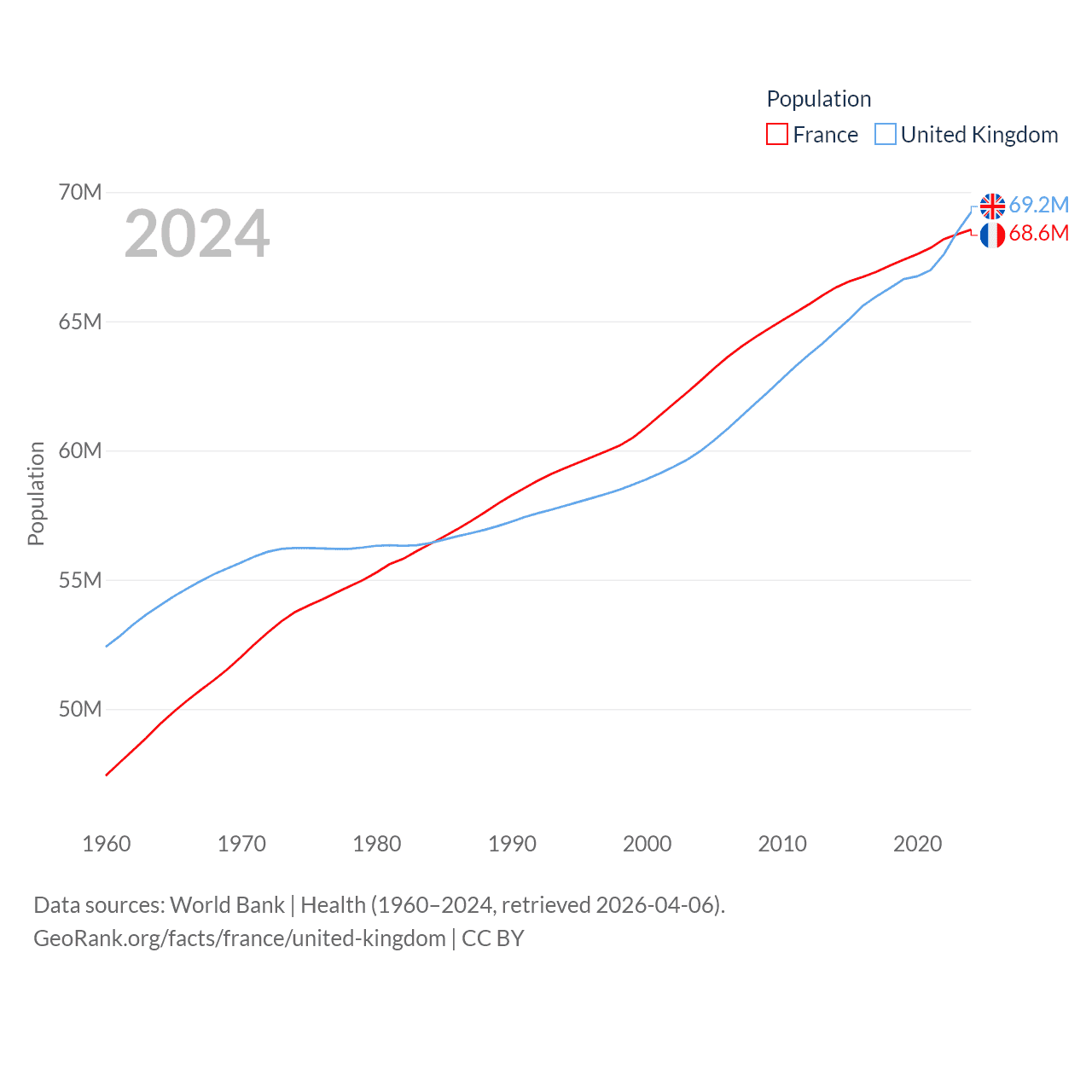 France has a population of 68.6M (ranked 23/197), compared with 69.2M in The United Kingdom (ranked 21/197). France's land area is 208,090 sq mi versus 93,410 sq mi for The United Kingdom (ranked 48th vs. 78th).