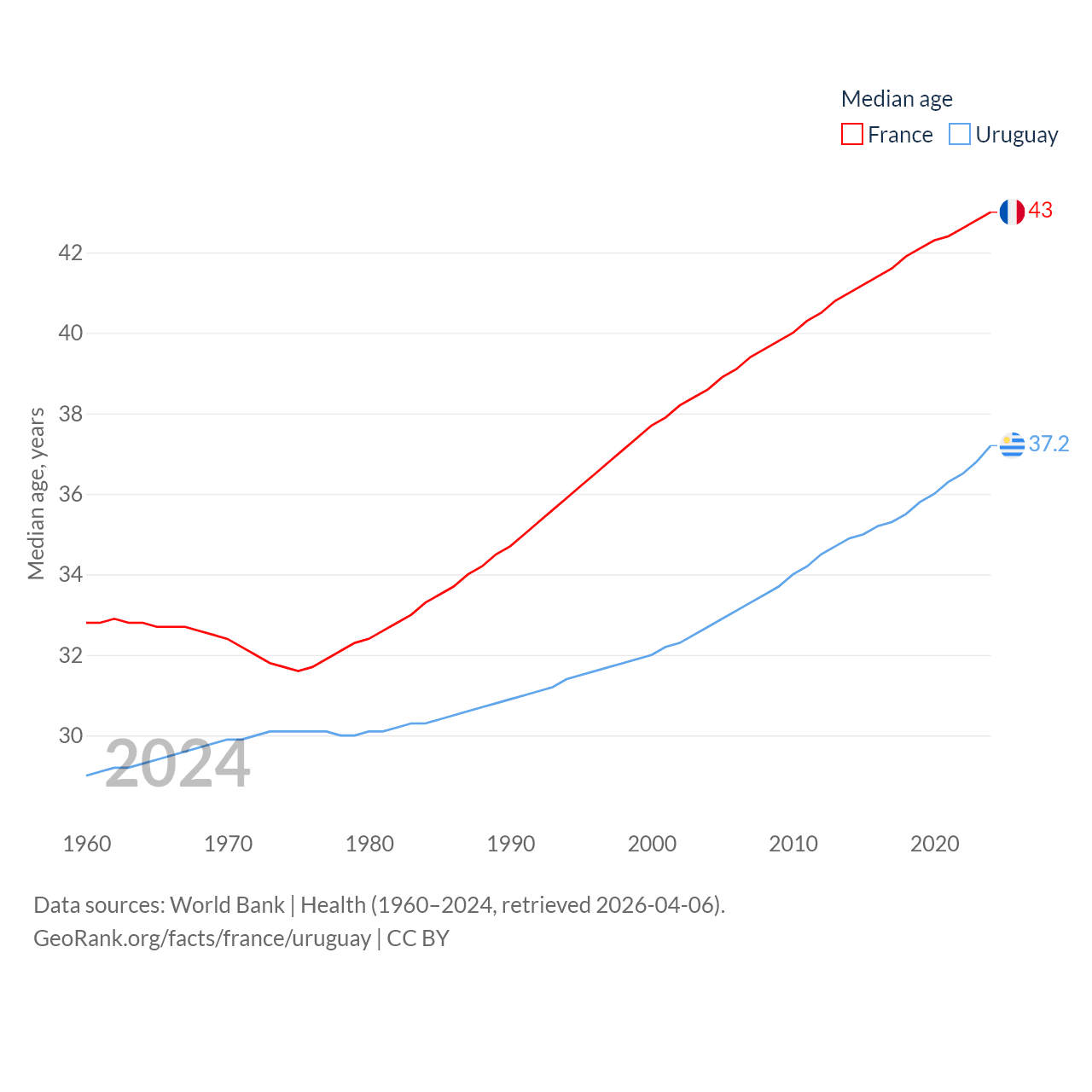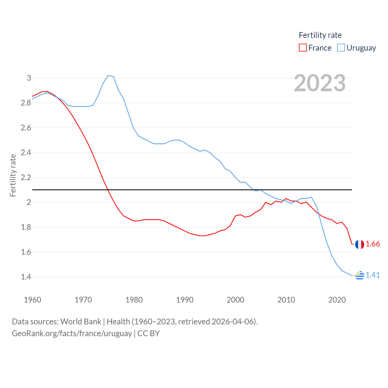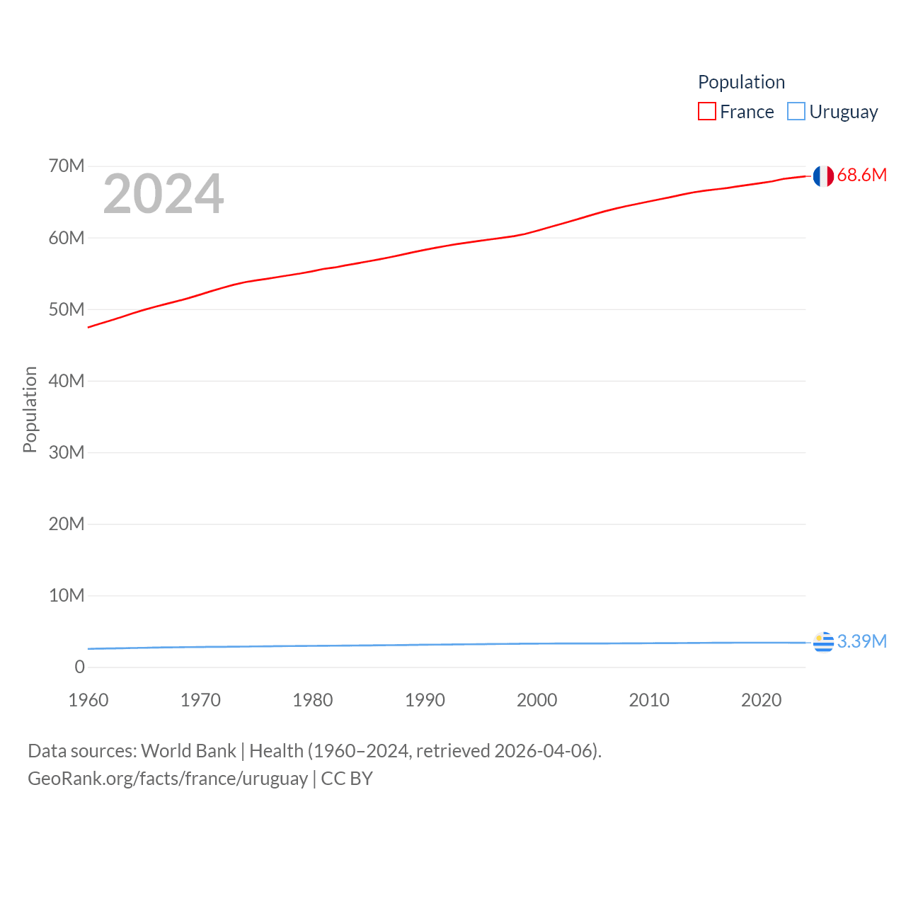 France has a population of 68.6M (ranked 23/197), compared with 3.39M in Uruguay (ranked 133/197). France's land area is 208,090 sq mi versus 67,576 sq mi for Uruguay (ranked 48th vs. 89th).