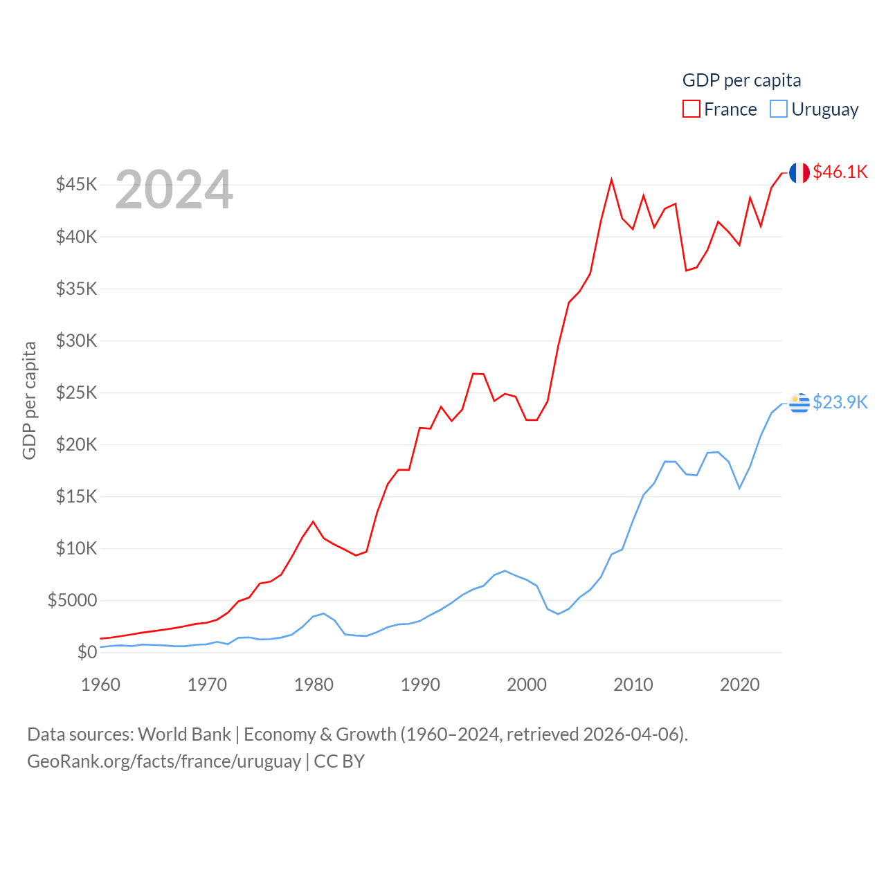 By GDP, France ranks 7/197 ($3.16T) and Uruguay ranks 81/197 ($81B). By GDP per capita, France ranks 27/197 ($46,103), while Uruguay ranks 52/197 ($23,907).
