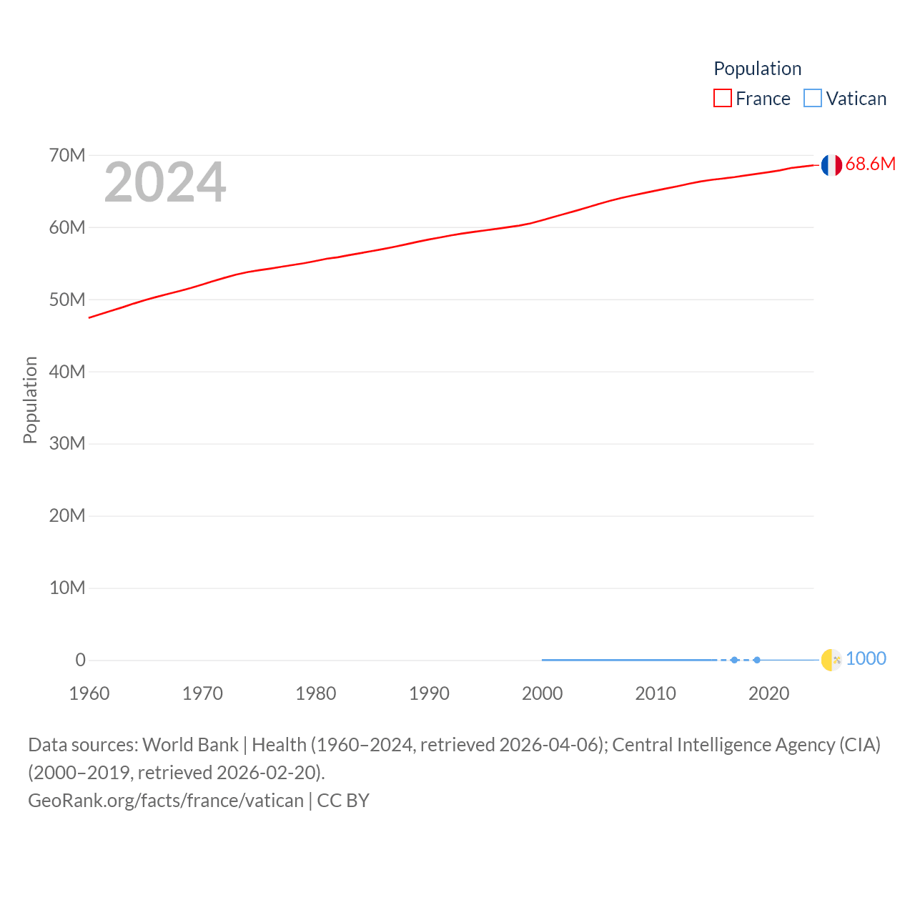 France has a population of 68.6M (ranked 23/197), compared with 1K in The Vatican (ranked 197/197). France's land area is 208,090 sq mi versus 0.17 sq mi for The Vatican (ranked 48th vs. 197th).