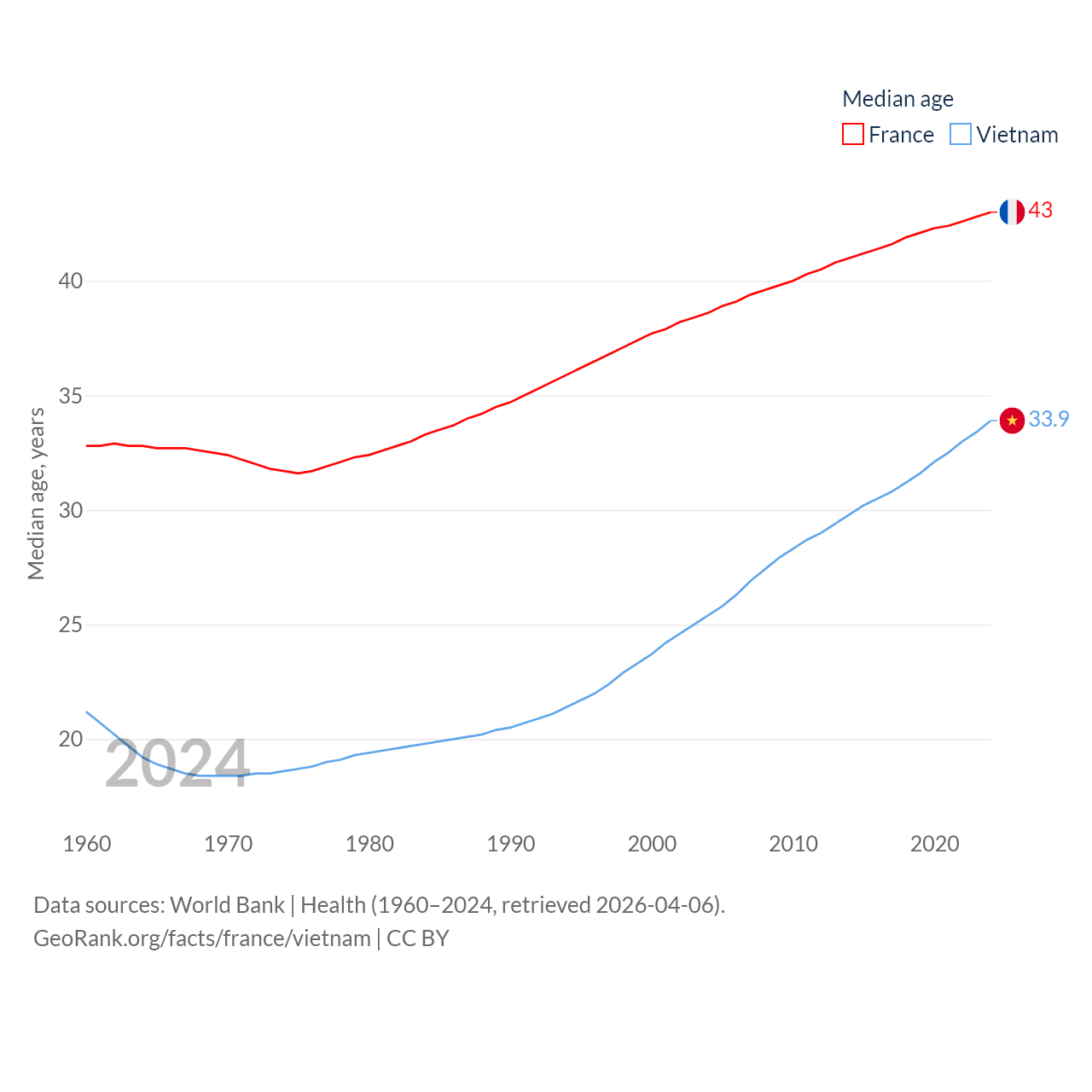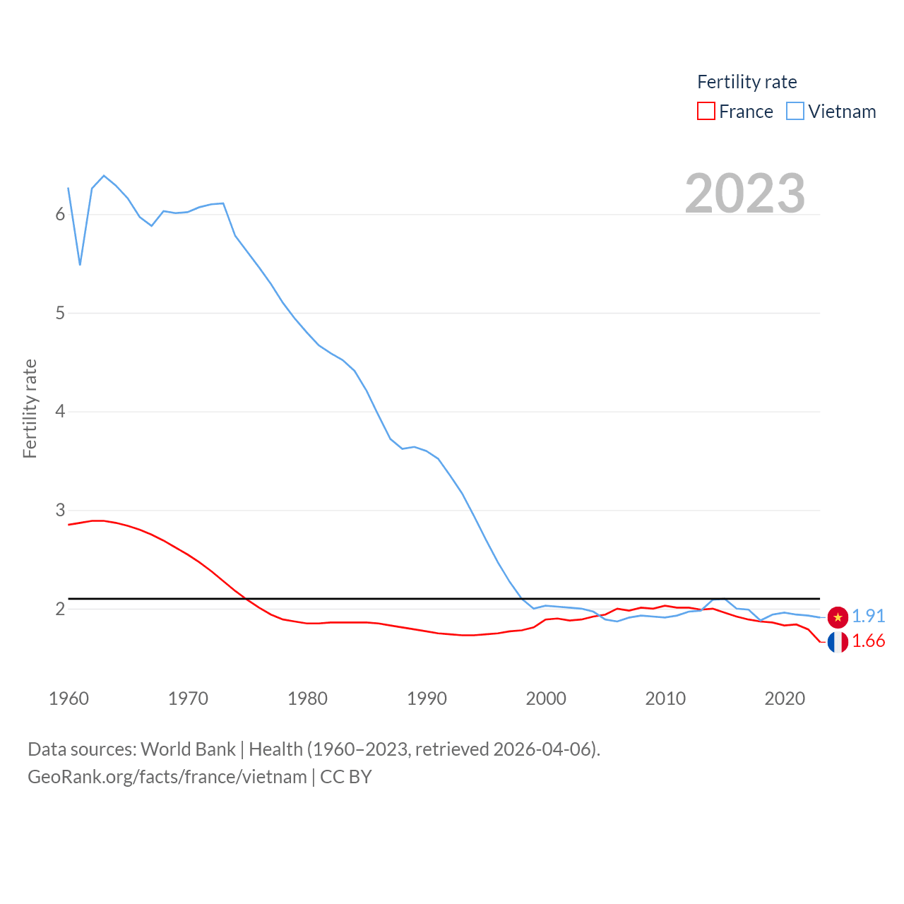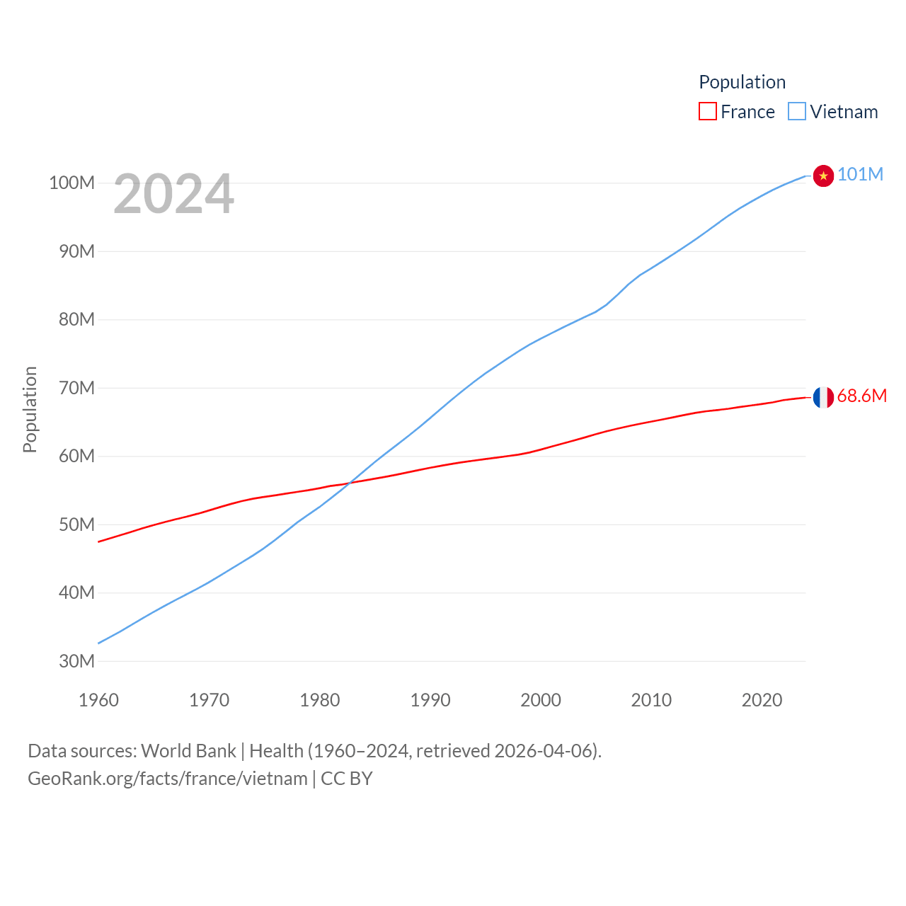 France has a population of 68.6M (ranked 23/197), compared with 101M in Vietnam (ranked 16/197). France's land area is 208,090 sq mi versus 121,016 sq mi for Vietnam (ranked 48th vs. 67th).