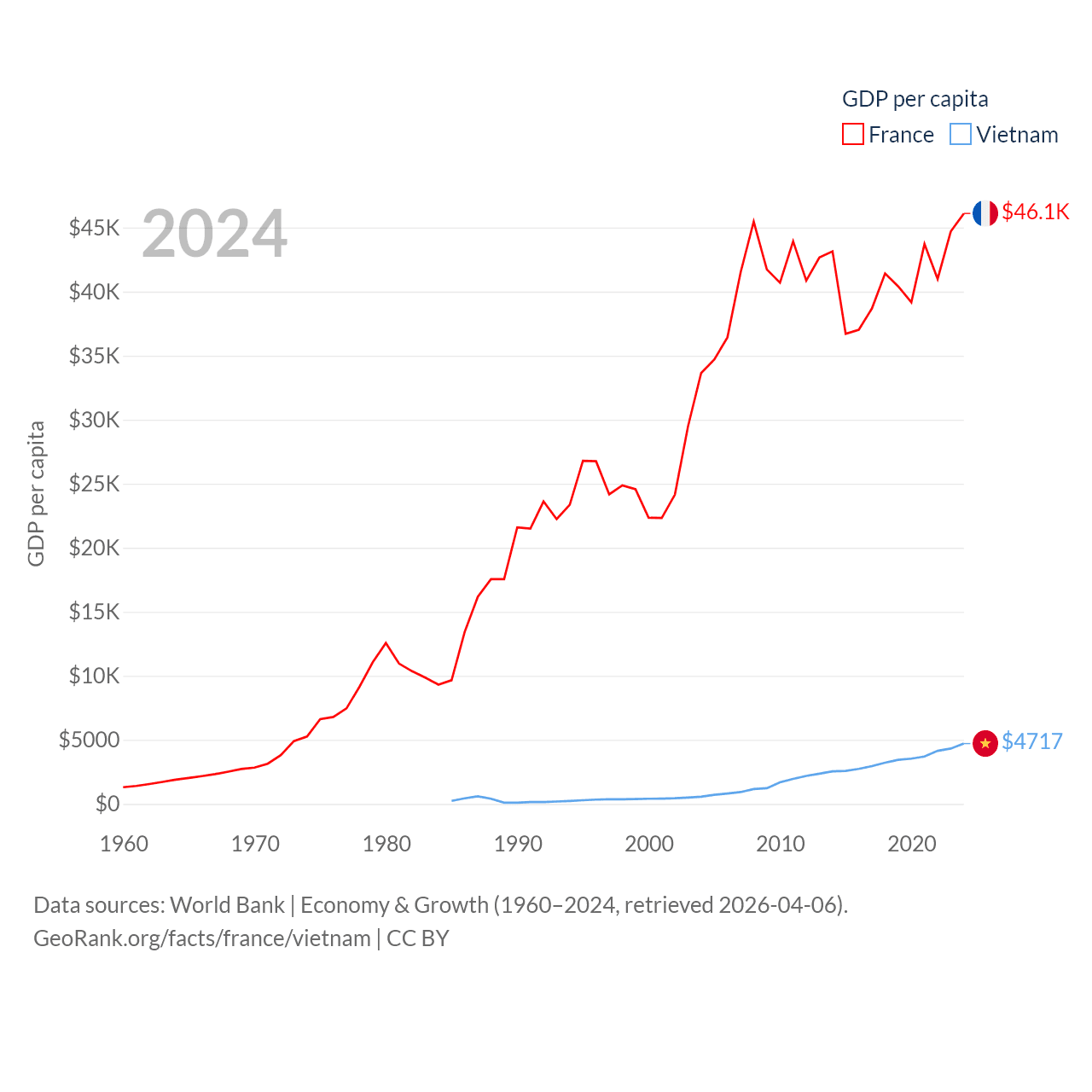 By GDP, France ranks 7/197 ($3.16T) and Vietnam ranks 33/197 ($476B). By GDP per capita, France ranks 27/197 ($46,103), while Vietnam ranks 122/197 ($4,717).