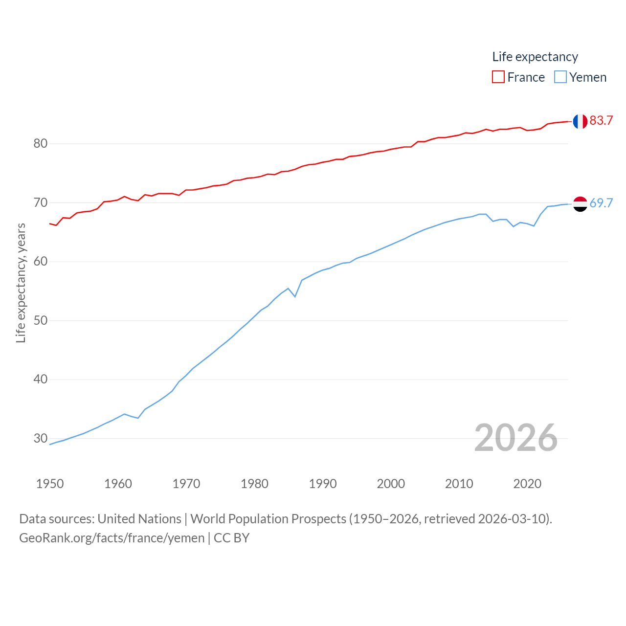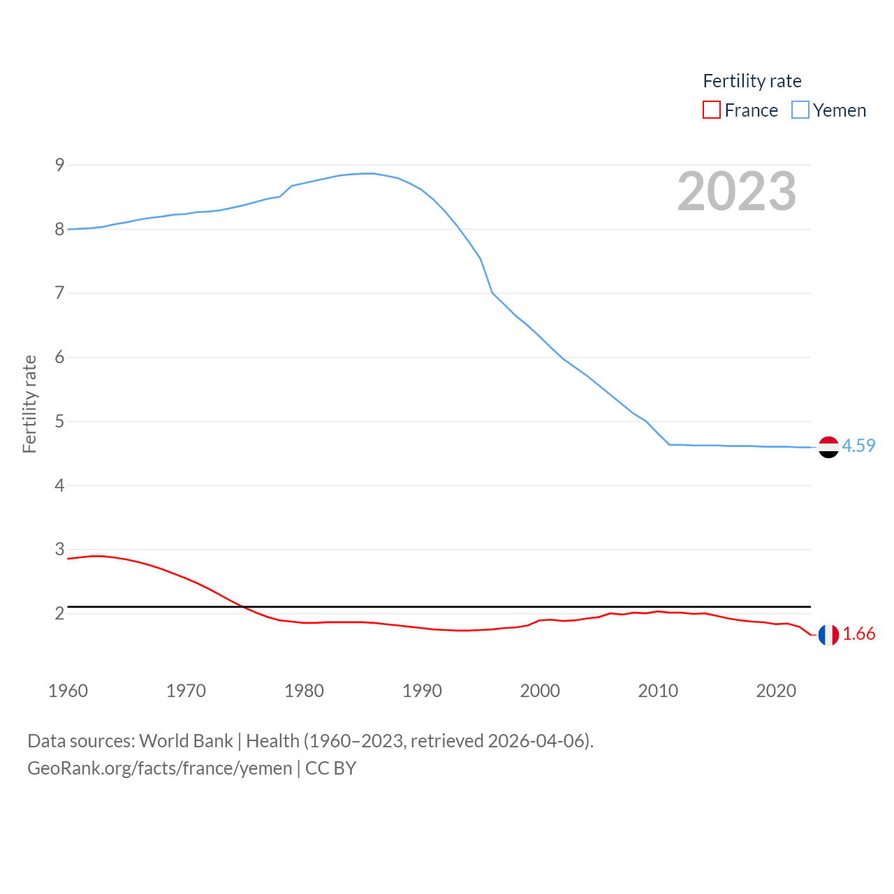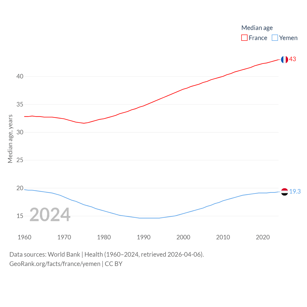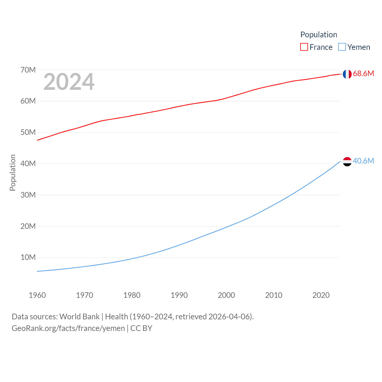 France has a population of 68.6M (ranked 23/197), compared with 40.6M in Yemen (ranked 38/197). France's land area is 208,090 sq mi versus 203,850 sq mi for Yemen (ranked 48th vs. 49th).