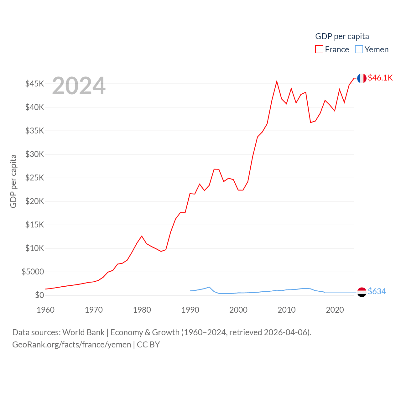 By GDP, France ranks 7/197 ($3.16T) and Yemen ranks 125/197 ($21.6B). By GDP per capita, France ranks 27/197 ($46,103), while Yemen ranks 191/197 ($634).