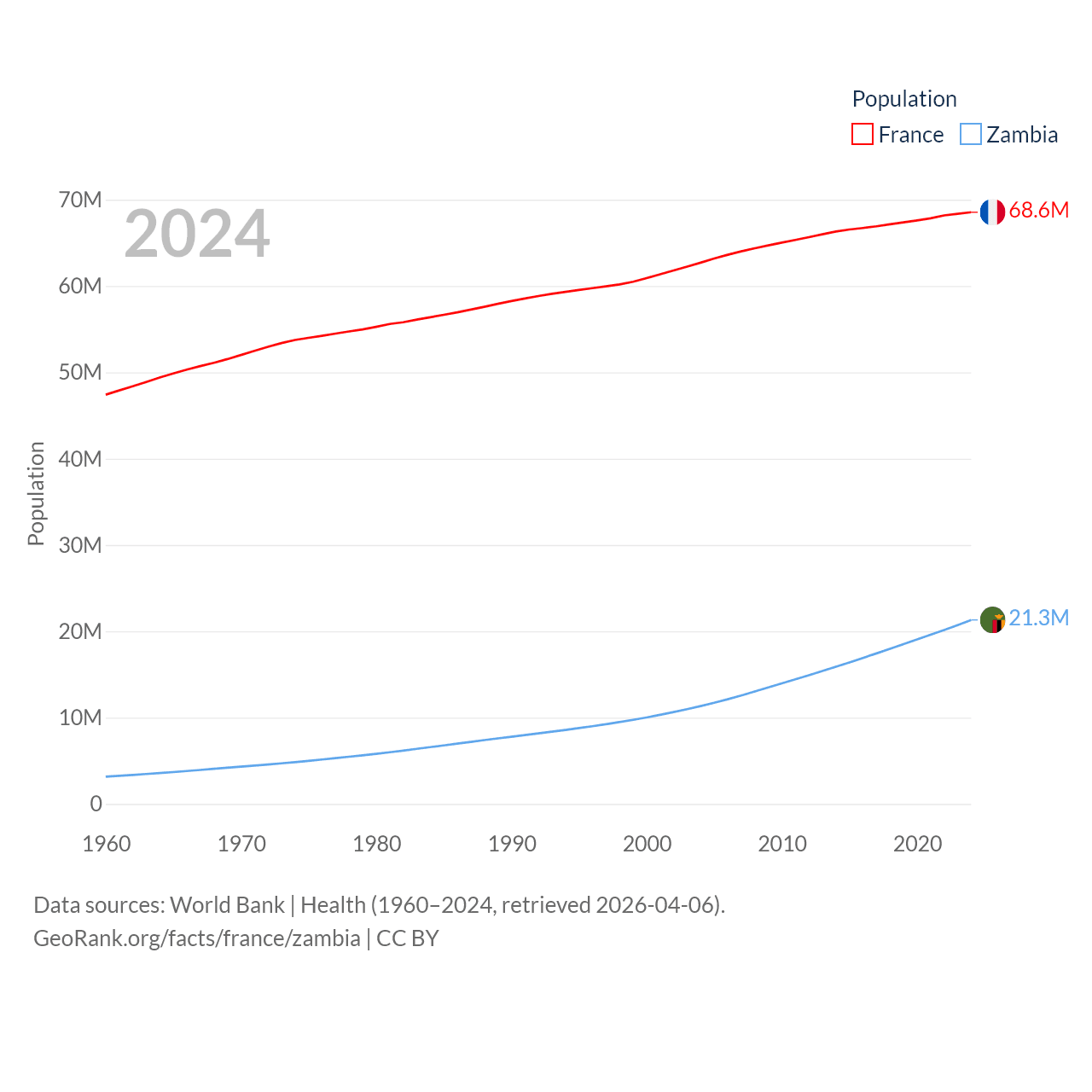 France has a population of 68.6M (ranked 23/197), compared with 21.3M in Zambia (ranked 63/197). France's land area is 208,090 sq mi versus 287,024 sq mi for Zambia (ranked 48th vs. 37th).