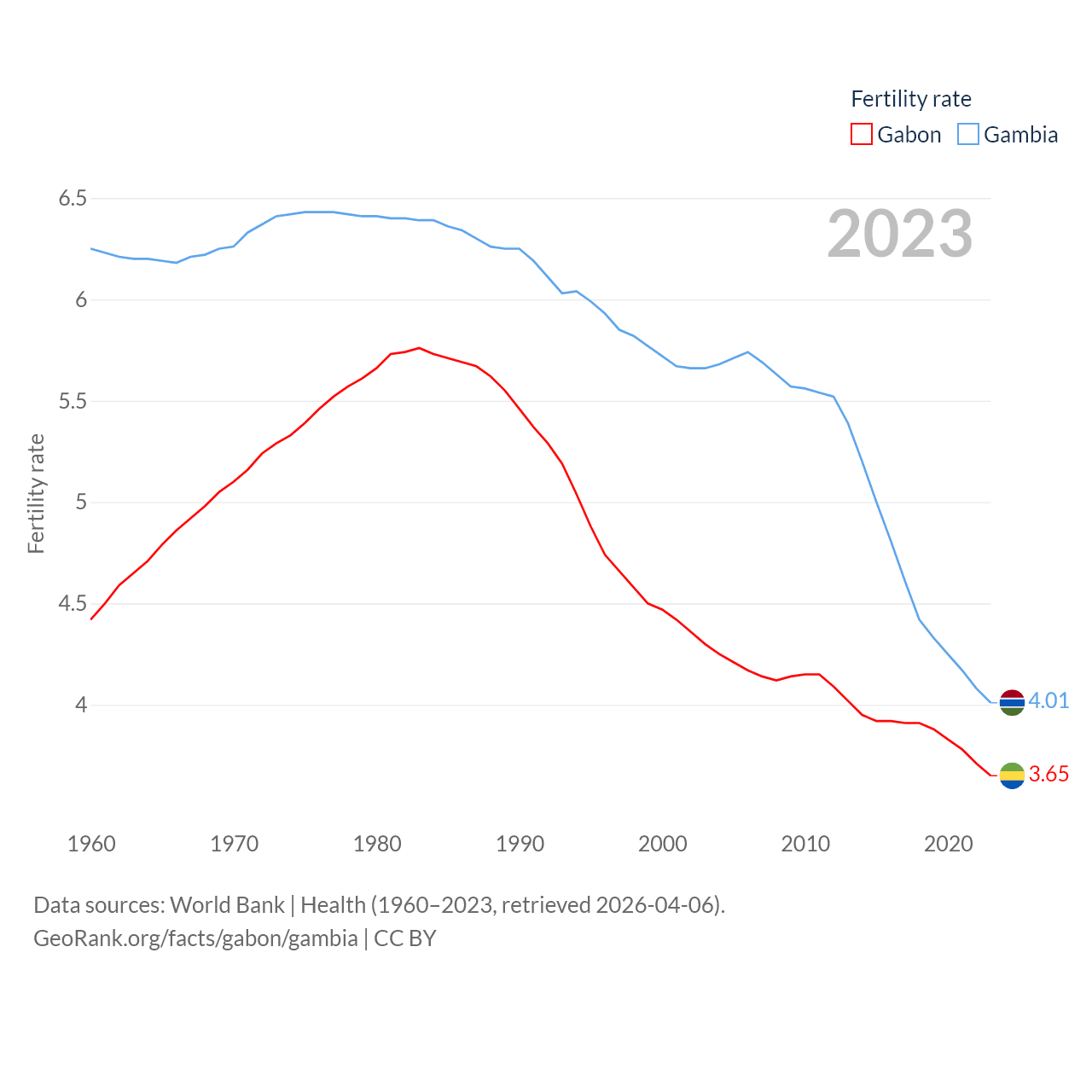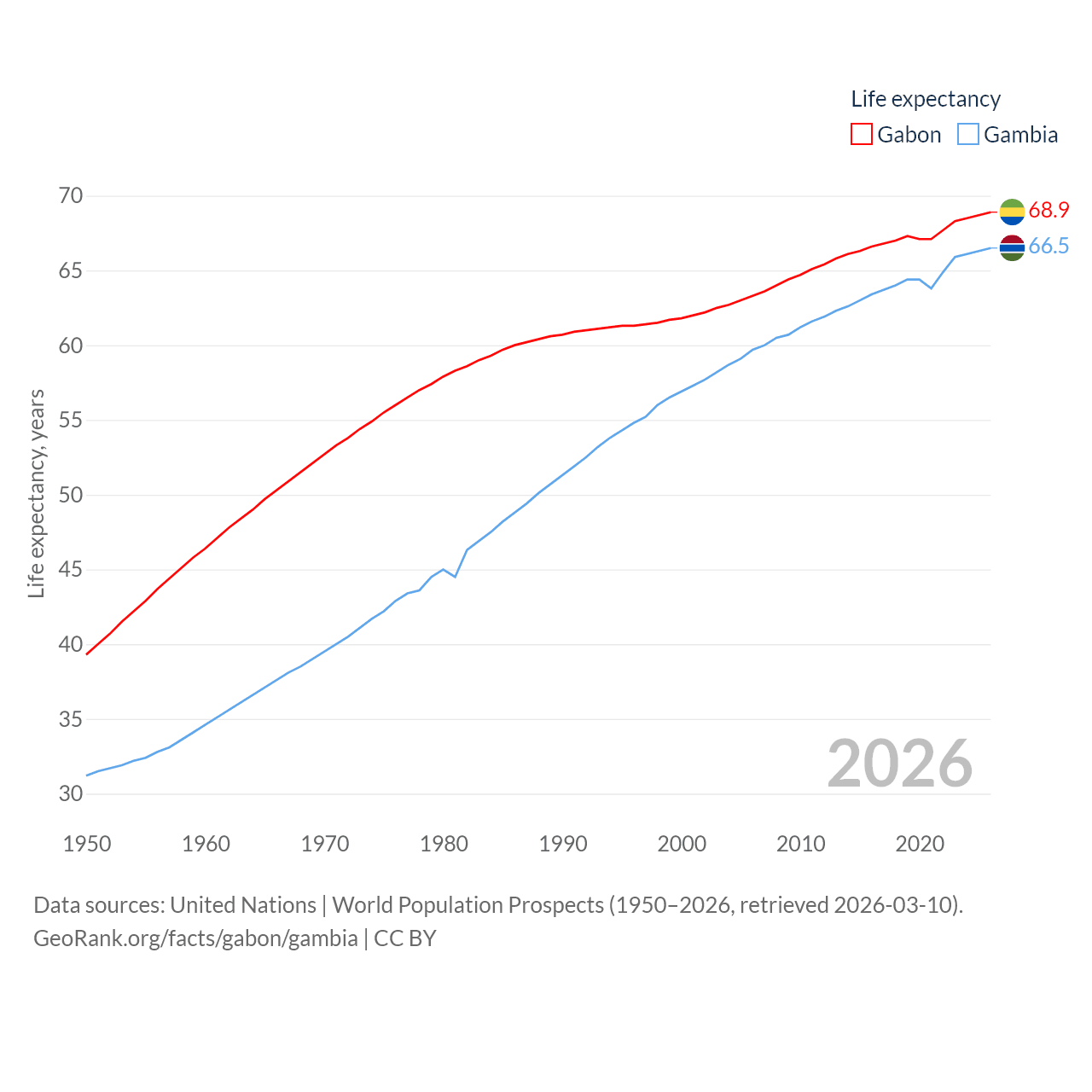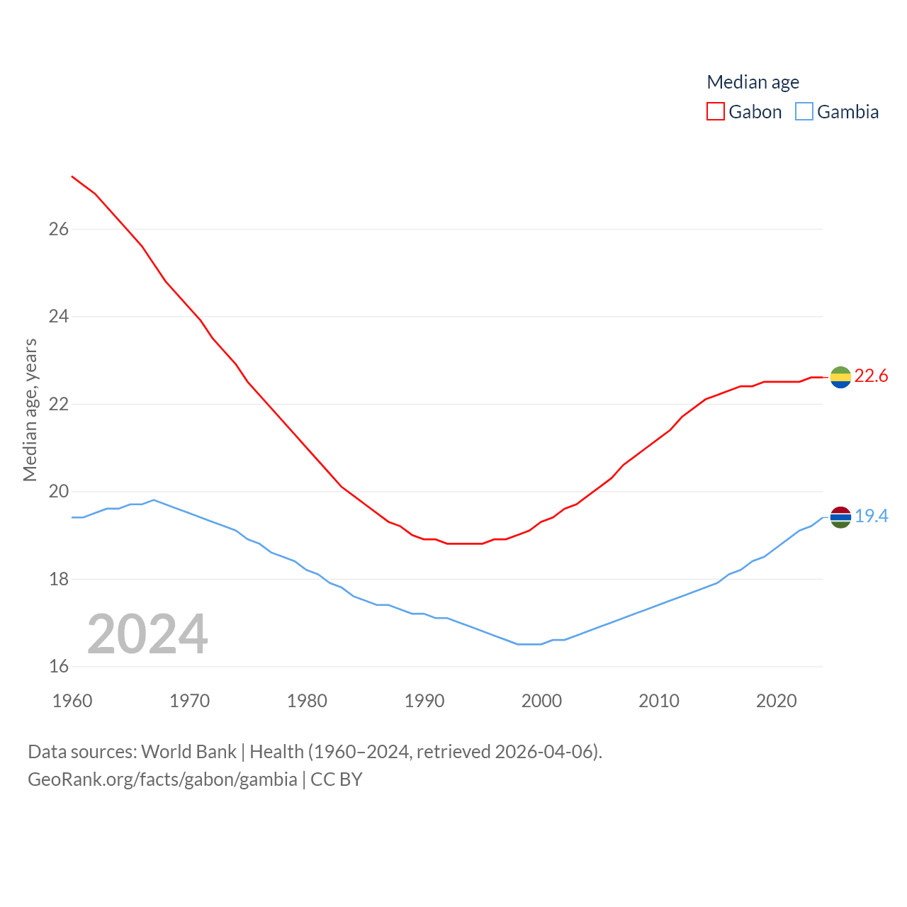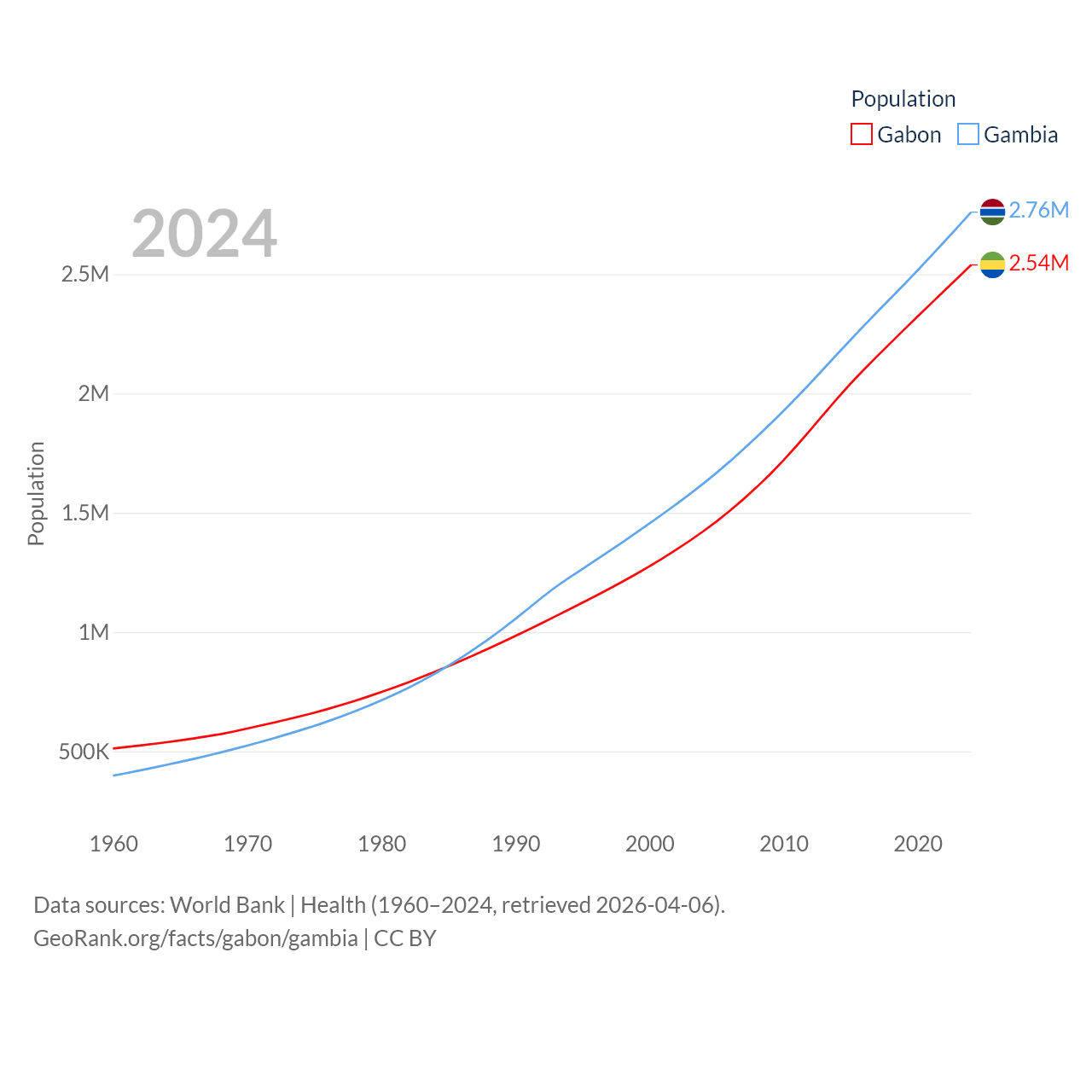 Gabon has a population of 2.54M (ranked 141/197), compared with 2.76M in The Gambia (ranked 140/197). Gabon's land area is 99,487 sq mi versus 3,907 sq mi for The Gambia (ranked 75th vs. 161st).