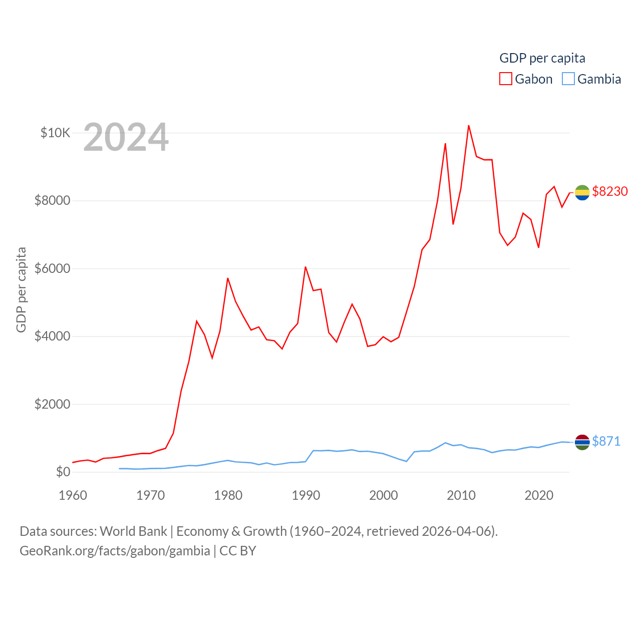 By GDP, Gabon ranks 127/197 ($20.9B) and The Gambia ranks 174/197 ($2.4B). By GDP per capita, Gabon ranks 93/197 ($8,230), while The Gambia ranks 183/197 ($871).