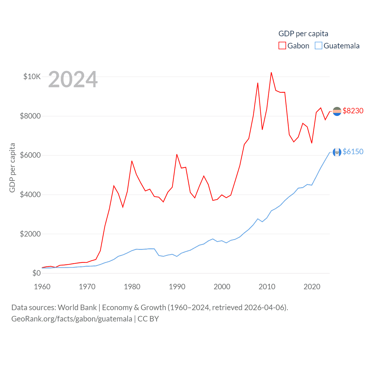 By GDP, Gabon ranks 127/197 ($20.9B) and Guatemala ranks 68/197 ($113B). By GDP per capita, Gabon ranks 93/197 ($8,230), while Guatemala ranks 112/197 ($6,150).